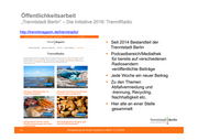 Öffentlichkeitsarbeit „Trenntstadt Berlin“ – Die Initiative 2016: TrenntRadio http://trenntmagazin.de/trenntradio/ Seit 2014 Bestandteil der Trenntstadt Berlin Podcastbereich/Mediathek für bereits auf verschiedenen Radiosendern veröffentlichte Beiträge Jede Woche ein neuer Beitrag Zu den Themen Abfallvermeidung und -trennung, Recycling, Nachhaltigkeit etc. Hier alle an einer Stelle gesammelt 16 Beiratsitzung der Dualen Systeme in Berlin 13.12.2016