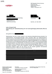 [U23] DDP Specialty Products Germany GmbH& Co. KG August-Wolf1-Strasse 13 29699 Bomlitz Telefon: +49 {0)5161 44-0 ~oUPONT~ Technische Universität Braunschweig Volkmaroder Str. 5 38104 Braunschweig Telefon •Durchwa h 1: Fax-Durchwahl : • Bomlitz, 16. Mai 2019 Letter of Support (LoS) Unterstützung der Standortbewerbung für c:llie Forschungsfertigung Batteriezelle (FFB) des BMBF Sehr geehrter Herrn Niedersachsen hat sich zu einem Hotspot in der deutschen Batterieforschung entwickelt. Die ausgezeichneten Forschungseinrichtungen sowie innovative KMU und Großunternehmen decken die gesamte Wertschöpfungskette von der Batterieentwicklung über die Produktion bis zum Recycling ab. Niedersachsen bietet somit hervorragende Bedingungen für eine erfolgreiche Etablierung der Forschungsfertigung Batteriezelle (FFB) des BMBF, der Demonstrationsanlage zur Massenproduktion von Batteriezellen. Die IFFB bietet hier die einmalige Möglichkeit, bereits vorhandenes Wissen entlang der gesamten B;1itterie-Wertschöpfungskette stärker zu bündeln und weiter auszubauen. Durch einen schnelleren Transfer von Prozessinnovationen in die industrielle Großserie ergibt sich die Chan1ce auf eine deutlich gestärkte internationale Wettbewerbsposition im Bereich der Batteriez~~llherstellung. ... 2 Bankkonto Frankfurt am Main: Deutsche Bank AG, Frankfurt Konto-Nr. 97129100 BLZ 500 700 10 DE75500700100097129100 SWIFT-Code: DEUTDEFFXXX Steuer 10-Nr.: DE318509650 Sitz: Bomlitz Handelsregister: Walsrode, HRA 20:3828 Persönlich haltende Gesellschafterin ~ DSP Germany GmbH Sitz: Neu-lsenburg Handelsregister: Offenbach a.M., HF~B 51353 Geschäftsführung~ Marlen Weigand, Norbert Klein, Karl Koob, Wolfgang Möller