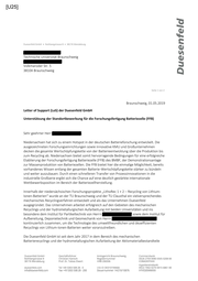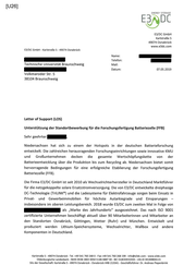 [U25] Duesenfeld Gm bH • Rot hbergstrasse 8 • 38 176 Wendebu rg Technische Universität Braunschweig Volkmaroder Str. 5 38104 Braunschweig Seit e 1 von 2 Braunschweig, 01.05 .2019 Letter of Support (LoS) der Duesenfeld GmbH Unterstützung der Standortbewerbung für die Forschungsfertigung Batteriezelle (FFB) Sehr geehrter Herr Niedersachsen hat sich zu einem Hotspot in der deutschen Batterieforschung entwickelt. Die ausgezeichneten Forschungseinrichtungen sowie innovative KMU und Großunternehmen decken die gesamte Wertschöpfungskette von der 13atterieentwicklung über die Produktion bis zum Recycling ab. Niedersachsen bietet somit hervorragende Bedingungen für eine erfolgreiche Etablierung der Forschungsfe rtigung Batteriezelle {FFB) des BMBF, der Demonstration sanlage zur Massenproduktion von Batteriezellen . Die FFB bietet hier die einmalige Möglichkeit, bereits vorhandenes Wissen entlang der gesamten Batterie-Wertschöpfungskette stärker zu bündeln und weiter auszubauen . Durch einen schnelleren Transfer von Prozessinnovationen in die industrielle Großserie ergibt sich die Chance auf eine deutlich gestärkte internatio nale Wettbewerbsposition im Bereich der Batteriezellherstellung. Innerhalb der niedersächsischen Forschungsprojekte "LithoRec 1 + 2- Recycling von Lithium- Ionen-Batterien " wurde an der TU Braunschweig und der TU Clausthal ein vielversprechendes mechanisches Recyclingverfahren entwickelt und als das Unternehmen Quesenfeld ausgegründet. Das Unternehmen arbeitet erfolgreich auf den Gebieten des mechanischen Recyclings und der hydrometallurgischen Aufarbeitung mit beiden Universitäten und ins besondere dem Institut für Partikeltechnik von Herrn Aufbe re itung, Deponietechnik und Geomechanik von Herrn kont in uierlich zusammen, um die Technologie des umweltfreundlichen und ökoeffizienten Recyclings von Lithium- Ionen-Batterien weiter voranzutreiben . Die Quesenfeld GmbH ist seit dem Jahr 2017 in dem Bereich des mechanischen Batterierecyclings und der hydrometallurgischen Aufarbeitung der Aktivmaterialbestandteile Duesenfeld GmbH Rothbergstrasse 8 38176 Wendeburg duesenfeld.com info@duesenfeld.com Geschäftsführer Christian Hanisch Prof. Dr. Tobias Elwert Tel +49 5303 508 28- 0 Fax +49 5303 508 28 - 200 Amtsgericht Braunschweig Registernummer HRB 206506 Commerzbank DE26 2704 0080 0505 0208 00 COBADEFFXXX USt-ID DE31 0194666 HypoVereinsbank DE22 7002 0270 0015 6861 00 Steuernummer 14/210/10876 HYVEDEMMXXX