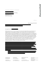 Duesenfeld GmbH • Rothbergstrasse 8 • 38176 Wendeburg Technische Universität Braun schweig Volkmaroder Str. 5 38104 Braunschweig Seite 1 von 2 Braunschweig, 20.05.2019 Sehr geehrter Herr Niedersachsen hat sich zu einem Hotspot in der deutschen Batterieforschung entwickelt . Die ausgezeichneten Forschungseinrichtungen sowie innovative KMU und Großunternehmen decken die gesamte Wertschöpfungskette von der 13atterieentwicklung über die Produktion bis zum Recycling ab. Niedersachsen bietet somit hervorragende Bedingungen für eine erfolgreiche Etablierung der Forschungsfertigung Batteriezelle (FFB) des BMBF, der Demon strationsa nlage zur Massenproduktion von Batteriezellen. Die FFB bietet hier die einmalige Möglichkeit, bereits vorhandenes Wissen entlang der gesamten Batterie-Wertschöpfungskette stärker zu bündeln und weiter auszubauen. Durch einen schnelleren Transfer von Prozessinnovationen in die industrielle Großserie ergibt sich die Chance auf eine deutlich gestärkte internationale Wettbewerbsposition im Bereich der Batteriezellherstellung. Duesenfeld GmbH Rothbergstrasse 8 38176 Wendeburg duesenfeld.com info@duesenfeld.com Geschäftsführer Christian Hanisch Prof. Dr. Tobias Elwert Tel +49 5303 508 28-0 Fax +49 5303 508 28 - 200 Amtsgericht Braunschweig RE!gisternummer HRB 206506 Commerzbank DE26 2704 0080 0505 0208 00 COBADEFFXXX USt-ID DE31 0194666 HypoVereinsbank DE22 7002 0270 0015 6861 00 Steuernummer 14/210/10876 HYVEDEMMXXX