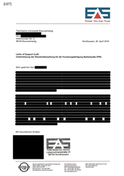 [U26] ENERGY STORAGE E~ DC E3/DC GmbH Karlstraße 5 49074 Osnabrück www.e3dc.com E3/DC GmbH- Karlstraße 5 - 49074 Osnabrück - Name: Telefon : Technische Universität Braunschweig Mai I: Datum : 07.05.2019 Volkmaroder Str. 5 38104 Braunschweig Letter of Support (LOS} Unterstützung der Standortbewerbung für di1e Forschungsfertigung Batteriezelle (FFB} Sehr g e e h r t e r - , Niedersachsen hat sich zu einem der Hotspots in der deutschen Batterieforschung entwickelt. Die zahlreichen herausragenden Forschungseinrichtungen sowie innovative KMU und Großunternehmen decken die gesamte Wertschöpfungskette von der Batterieentwicklung über die Produktion bis zum Recycling ab. Niedersachsen bietet somit hervorragende Bedingungen für eine erfolgreiche Etablierung der Forschungsfertigung Batteriezelle (FFB ). Die Firma E3/DC GmbH ist seit 2010 als Wechselrichterhersteller in Deutschland Marktführer für die netzgekoppelte solare Ersatzstromversorgung. Die von E3/DC entwickelte dreiphasige DC-Technologie (TriLINK®) und die Ladesystenne für Elektrofahrzeuge sorgen beim Einsatz in Privat- und Gewerbeimmobilien für höchste Autarkiegrade und Einsparungen - insbesondere im oberen Leistungsbereich . 20:18 wurde E3/DC zum zweiten Mal in Folge von als "Marke des Jahrhunderts" ausgezeichnet. Das nach ISO 9001 zertifizierte Unternehmen beschäftigt aktuell über 90 Mitarbeiterinnen und Mitarbeiter an den Standorten Osnabrück, Göttingen, Wetter (Ruhr) und München. Entwickelt und produziert werden Lithium-Speichersysteme, Wechselrichter, Wallbox und andere Komponenten in Deutschland. Karlstraße 5-49074 Osnabrück- Tel. +49 541 760 268 0- Fax +49 541 760 268 199- info@e3dc.com- www.e3dc.com Oldenburgische Landesbank- IBAN DE48 2802 0050 5186 6887 00- BIC OLBODEH2XXX- USt.ID DE269804115 Sitz der Gesellschaft: Karlstraße 5- 49074 Osnabrück- Osnabrück HRB 213341- Geschäftsführer: Dr. Andreas Piepenbrink