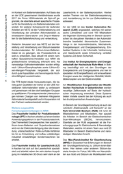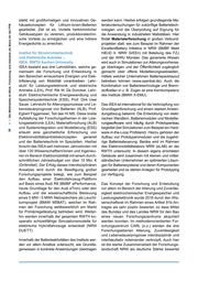 al LL. LL. .!!! 'tl - ... :::I .!!! t/) ns al stärkt mit großformatigen und innovativen Ge- häusekonzepten für Lithium-Ionen-Batterien gearbeitet. Ziel ist es, Vorteile herkömmlicher Gehäusetypen zu vereinen , produktionstechni- sche Vorteile zu ermöglichen und eine höhere Energiedichte zu erreichen . ~ ns Cl> ·;: u; ::I 'tl c: 'tl c: ::I Cl c: ::I .r:: (.) ~ 0 LL. _;.: .!:! iii E Cl> ~ ... :ns ....E Q; ;: Cl> c ,.; • CO N Institut für Stromrichtertechnik und Elektrische Antriebe - ISEA, RWTH Aachen University ISEA besteht aus drei Lehrstühlen , welche ge- meinsam die Forschung und Entwicklung in den Bereichen erneuerbare Energien und Elek- trifizierung von Mobilität vorantreiben: Lehr- stuhl für Leistungselektronik und elektrische Antriebe (LEA), Prof. Rik W. Oe Doncker, Lehr- stuhl Elektrochemische Energiewandlung und Speichersystemtechnik (ESS), Prof. Dirk Uwe Sauer, Lehrstuhl für Alterungsprozesse und Le- bensdauerprognose von Batterien (ALB), Prof. Egbert Figgemeier, Teil des Hl MS . Diese breite Aufstellung der Forschungsthemen in der Leis- tungselektronik (LEA), Materialforschung (ALB) und Systemintegration und Modeliierung (ESS) erlaubt eine ganzheitliche Erforschung von generell Elektromobilitätsantriebskonzepten und der Batterietechnik im Speziellen. Hierbei forscht das ISEA seit mehreren Jahrzehnten mit über 120 Wissenschaftlern/innen und Ingenieu- ren im Bereich Elektromobilität mit einem durch- schnittlichen Jahresbudget von über 10 Mio. € (Drittmittel). Der Erfolg dieses interdisziplinären Ansatzes wird durch die Bewilligung großer Forschungsprojekte belegt, wie zum Beispiel den Aufbau einer Elektrofahrzeug-Plattform auf Basis eines Audi R8 (BMBF ePerformance, heute Grundlage für den Audi eTron) oder den Aufbau und die wissenschaftliche Betreuung eines 5 MW I 5 MWh Netzspeichers als Leucht- turmprojekt (BMWI M5BAT), welcher im Rah- men der Forschung wettbewerblieh am Markt für Primärregelleistung betrieben wird . Weiter- hin werden innerhalb der gesamten RWTH ko- operativ echtzeitfähige Simulationsmodelle für elektrische Hybridfahrzeuge entwickelt (NRW DUETT). Innerhalb der Batterieaktivitäten des Instituts wer- den vor allem Ansätze untersucht, wie Grundla- genwissen in konkrete Anwendungen übertragen werden kann. Hierbei erfolgen grundlegende Ma- terialuntersuchungen für zukünftige Batterietech- nologien und die Überprüfung auf Eignung für die Anwendung in industriellen Maßstäben. Hier findet Materialerforschung in großen Verbund- projekten statt, wie zum Beispiel im Rahmen der ExcellentBattery Initiative in NRW (BMBF Meet HiEnD II , NRW GrEEn) mit Beteilung des FZJ und der WWU Münster. Das generierte Wissen wird auch in Simulationen zur Alterungsvorhersa- ge übertragen und der Öffentlichkeit zugänglich gemacht über offene Modellierungswebseiten, mittels welcher Unternehmen Batteriepacklayout betreiben können (www.openbat.de ). Auch die Kombination von Batterietechnologie und Brenn- stoffzellen in z. B. Zügen ist eine Kernkompetenz des Instituts (BMWI X-EMU). Das ISEA ist international für die Verknüpfung von Grundlagenforschung und einem starken Anwen- dungsbezug bekannt. Die Entwicklung von elekt- rischen Wandlern, Batteriemodulen und Modellie- rungssoftware wird häufig durch Prototypenbau begleitet (bei Simulationen zum Beispiel ein Hard- ware-in-the-Loop Prüfstand). Hierzu gehören der Aufbau von Prototypenmodulen und die zugehö- rige Batteriesteuerung. Beides wird im Rahmen des Elektromobilitätslabors NRW (eLAB) an der RWTH untersucht. ln diesem eigens errichteten Gebäude wird zusammen mit kleinen und mittel- ständischen Unternehmen an optimierten Lösun- gen für Batteriesysteme und deren Komponenten gearbeitet und es stehen Anlagen für Prototyping zur Verfügung. Das Konzept der Forschung und Entwicklung vor allem im Bereich der Alterung und Zuverläs- sigkeit elektrochemischer Energiespeicher und Leistungselektronik wurde 2016 durch den Wis- senschaftsrat im Rahmen eines Artikel 91 b-An- trages als sehr positiv bewertet, so dass Mittel des Bundes und des Landes NRW für den Bau eines neuen Forschungszentrums akquiriert werden konnten. Im methodenorientierten For- schungszentrum CARL (s.o.) werden die drei Forschungsebenen Alterung, Zuverlässigkeit und Lebensdauerprognose interdisziplinär und interfakultativ miteinander verknüpft. Auch hier ist die starke Zusammenarbeit der Forschungs- landschaft NRW als deutliche Stärke bewertet