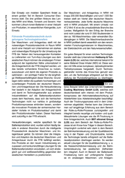 lll u.. u.. .!!! 't:J ...::I ....!!! Vl ns lll .!!!. ns Der Einsatz von mobilen Speichern findet zu einem großen Teil im Bereich Consumer Elec- tronics statt. Die drei größten Akteure des Lan- des NRW sind Miele, Vorwerk und Severin. Hier kommen Lithium-Ionen-Batterien in einer Vielzahl von Produkten, im wesentlichen Kleingeräte, zum Einsatz. Q) ·;:: ....Vl :I 't:J c: 't:J c: :I Cl c: :I ~ (.) I!! 0 u.. _;.: .~ iii E Q) .:li: ... :ns ....E Qj ~ Q) Q "; • Führende Produktionstechnik durch gelungene Technologietransfers Der Maschinen- und Anlagenbau stellt mit der notwendigen Produktionstechnik im Raum NRW durch eine Vielzahl von Unternehmen ein starkes und notwendiges Rückgrat für die Umsetzung der FFB dar. Neben den herausragenden Kontakten zu Lieferanten von Turn-Key-Lösungen aus dem asiatischen Raum können die ansässigen Firmen aufgrund der logistischen Nähe unkompliziert in die Anlagentechnik der FFB integriert werden, um das bereits vorhandene Know-how zu nutzen, auszubauen und damit die eigenen Produkte zu optimieren- ein wichtiger Faktor für die langfristi- ge Wettbewerbsfähigkeit dieser Branche. Grund- lagen dafür stellen die qualitativ hochwertigen und zuverlässigen Produkte der deutschen Maschi- nen- und Anlagenbauer dar. Die Herausforderung hier besteht in der Adaption der Anlagentechnik und damit im Technologietransfer aus anderen Industriefeldern auf die Batteriezellproduktion sowie dem Nachweis, dass sich die heimischen Technologien nicht nur nahtlos in großskalige Produktionsprozesse einbinden lassen, sondern die innovativen Produkte der einheimischen Her- steller Vorteile im Produktionsablauf und damit den Produktionskosten haben. Dieser Nachweis wird zukünftig in der FFB erbracht. Herausforderungen, welche spezifisch für die Batterieproduktion sind, wurden schon häufig be- reits in anderen Branchen durch die intelligente Prozesstechnik deutscher Maschinen- und An- lagenbauer gelöst. So können über die Integra- tion und Adaption die deutschen Maschinen- und Anlagenbauer durch die FFB befähigt werden, ihre Produkte an den neuen Industriezweig an- zupassen und konkurrenzfähige Lösungen für die Batteriezellproduktion anzubieten, um sich strate- gisch gut und wettbewerbsfähig gegenüber den asiatischen Herstellern zu positionieren. Der Maschinen- und Anlagenbau in NRW mit knapp 200.000 Beschäftigten und rund 1.500 Be- trieben stellt ein Viertel aller deutschen Maschi- nenbaubetriebe. Jede fünfte deutsche Maschine wird in NRW produziert. Mit einem Umsatz von 47,2 Mrd. € ist es die umsatzstärkste Branche des Landes. Maßgeblich für den Erfolg der Branche sind nicht zuletzt die rund 51.500 Studierenden in den ca. 160 Maschinenbau- oder verwandten Stu- diengängen in NRW. Die Maschinenbaubranche in NRW profitiert damit wesentlich von den renom- mierten Forschungsinstanzen im Maschinenbau, der Elektrotechnik und den Naturwissenschaften. Ein gutes Beispiel für einen solchen Technologie- transfer stellt das Unternehmen Heitkamp & Tuh- mann (LOI) dar, welches international bekannt für seine Metered Dose lnhaler (MDI) ist. Diese wer- den mit Hilfe eines komplexen, taktzeitoptimierten Tiefziehprozesses hergestellt. Durch Technolo- gietransfer konnte das Know-how genutzt wer- den, um die Technologie erfolgreich auf die Her- stellu der Rundzelle Ein wei- teres Beispiel liefert das Unternehmen Coatema Coating Machinery GmbH (LOI), welches sich deutschlandweit sehr intensiv mit dem Produk- tionsprozess der Aktivmaterialbeschichtung auf Abieiterfolien bzw. Ableiterstreckgitter beschäftigt. Auch der Trocknungsprozess wird in dem Unter- nehmen abgebildet. Hierbei kann das Unterneh- men auf langjährige Erfahrung aus dem Bereich der Rolle-zu-Rolle-Prozesse zurückgreifen und integriert bereits neuartige und kosten- und quali- tätsoptimierte Lösungen wie die IR-Trocknung in ihrer Anlagentechnik. Auch BST eltromat Group (LOI) aus dem Bereich der Rolle-zu-Rolle-Pro- zesse ist ein Know-how Träger in diesem Bereich. Ursprünglich zunächst sehr stark in dem Bereich der Bahnkantensteuerung und der Qualitätssiche- rung in der Papier- und Druckindustrie, konnte die Technologie bereits erfolgreich auf die Batte- riezellproduktion übertragen werden. So werden aktuell Lösungen für die Qualitätssicherung, u. a. die Nassschichtdickenmessung und die Bahn- kantensteuerung bei asiatischen Zellherstel- lern integriert. Auch im Bereich der Batteriezeii- Finalisierung kann auf umfangreiche Experti- se im ansässigen Maschinen- und Anlagen-
