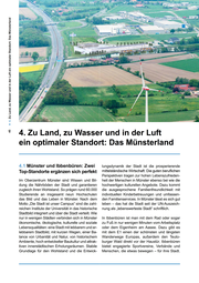 ~ 0 "'0 c: ns .... (/) ... ..9:! ns E :;::; c. 0 c: 'iii ::::I ....J ...Cl> "'0 "'0 c: :I ...Cl> t/) t/) ~ :I N "'0 c: ns ....J :I N ...t • 4. Zu Land, zu Wasser und in der Luft ein optimaler Standort: Das Münsterland 4.1 Münster und lbbenbüren: Zwei Top-Standorte ergänzen sich perfekt Im Oberzentrum Münster sind Wissen und Bil- dung die Nährböden der Stadt und garantieren zugleich ihren Wohlstand . So prägen rund 60.000 Studierende an insgesamt neun Hochschulen das Bild und das Leben in Münster. Nach dem Motto "Die Stadt ist unser Campus" sind die zahl- reichen Institute der Universität in das historische Stadtbild integriert und über die Stadt verteilt. Wie nur in wenigen Städten verbinden sich in Münster ökonomische, ökologische, kulturelle und soziale Lebensqualitäten: eine Stadt mit lebbarem und er- lebbarem Stadtbild , mit kurzen Wegen , einer Ba- lance von Urbanität und Natur, von historischem Ambiente, hoch entwickelter Baukultur und attrak- tiven innerstädtischen Erholungsräumen. Stabile Grundlage für den Wohlstand und die Entwick- lungsdynamik der Stadt ist die prosperierende mittelständische Wirtschaft. Die guten beruflichen Perspektiven tragen zur hohen Lebenszufrieden- heit der Menschen in Münster ebenso bei wie die hochwertigen kulturellen Angebote. Dazu kommt die ausgesprochene Familienfreundlichkeit mit individuellen Kinderbetreuungen und umfassen- den Familienservices. ln Münster lässt es sich gut leben -das hat die Stadt seit der UN-Auszeich- nung als "lebenswerteste Stadt" schriftlich. ln lbbenbüren ist man mit dem Rad oder sogar zu Fuß in nur wenigen Minuten vom Arbeitsplatz oder dem Eigenheim am Aasee. Dazu gibt es mit dem E1 einen der schönsten und längsten Wanderwege Europas, außerdem den Teuto- burger Wald direkt vor der Haustür. lbbenbüren bietet engagierte Sportvereine, Verbände und Menschen, die etwas bewegen -für ihre Stadt.