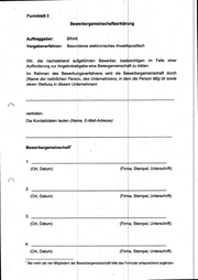 Formblatt 3 . Auftraggeber: . BRAK Bewerbergemeinschaftserklärung Vergabeverfahren: Besonderes elskfroriisches Anwaltspostfach Wir, die nachstehend | uch Bewerber, beabsichtigen im Falle einer Aufforderung zur Angebotsabgabe eine Bietergemeinschaft zu bilden. Im: Rahmen des Bewerbungsverfahrens wird die Bewerbergemeinschaft durch . (Name der natürlichen Person, des Unternehmens, in dem die Person tätig ist sowie : deren Stellung i in diesem Unternehmen) ‘vertreten. Die Kontaktdaten lauten (Name E-Mail-Adresse) i Bewerbergemeinschaft! 1. (Ort, Datum) (Firma, Stempel, Unterschrift) - 2... (Ort, Datum) (Firma, Stempel, Unterschrift) I (Ort, Datum) (Firma, Stempel, Unterschrift) 4. (Ort, Datum) (Firma, Stempel, Unterschrift) ' Bei mehr als vier Mitgliedern der Bewerbergemeinschaft bitte das Formular entsprechend ergänzen.
