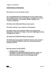 Anlage 2 zur Vvfg 16/2016 Hygienehinweis zur Händereinigung Wie wäscht man sich die Hände richtig? Die richtige Methode beim Händewaschen ist sehr wichtig. Seife allein genügt nämlich nicht, um die Keime unschädlich zu machen. Erst die Kombination von Einseifen, Reiben, Abspülen und Trocknen schafft das. Die Hände unter fließendem Wass.er nass machen. Die Hände einseifen, wenn möglich mit Flüssigseife. Die Hände reiben, bis es schäumt. Dabei nicht vergessen den Handrücken, zwischen den Fingern, unter den Fingernägeln und die Handgelenke zu reiben. Die Hände unter fließendem Wasser gut abspülen. Die Hände mit einem sauberen Handtuch trocknen, wenn möglich mit einem Wegwerf-Papiertuch oder einer einmal benutzbaren Stoffhandtuch rolle. Bemerkenswertes KURZ GESAGT: • Händeschütteln vermeiden • Sorgfältig und regelmäßig die Hände waschen - immer vor dem Essen und z.B. nach der Benutzung einer Maske • Nicht in die Hand sondern in die Armbeuge niesen - Stand 04.08.2015 Seite 6 von 6