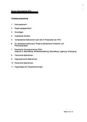 Inhaltsverzeichnis 1. Geltungsbereich 2. Regelungsgegenstand 3. Grundlagen 4. Auslösende Situation 5. Vorbereitende Maßnahmen nach dem 6 Phasenplan der WHO 6. Zur Betriebsdurchführung in Phase 6 erforderliche Funktionen und Personengruppen 7. Persönliche Schutzausrüstung (PSA) Zeitpunkt d. Beschaffung, Mindestausstattung, Beschaffung, Lagerung, Entsorgung 8. Technische Maßnahmen 9. Organisatorische Maßnahmen 10. Persönliche Maßnahmen 11. Hygienetipps bei Grippeerkrankungen Seite 2 von 10