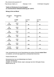 099a_Selbsteinschätzungstabelle 2017 Freie Schule in Berlin e.V. Viktoriastr. 13-18 12105 Berlin-Tempelhof Tabelle mit Richtwerten für das Schulgeld zur verantwortlichen Selbsteinschätzung (ab 1.8.2017) Betrag je Kind und Monat Jahreseink. Monatsbeitrag in € in € 1. Kind 2. Kind 3. Kind 100% 80% 60% bis mind. 22.500 100 80 60 bis mind. 28.000 120 96 72 bis mind. 34.000 140 112 84 bis mind. 40.000 160 128 96 bis mind. 46.000 190 152 114 bis mind. 52.000 240 192 144 52.000 mind. und mehr 290 232 174 Unter Jahreseinkommen ist der Gesamtbetrag der positiven Einkünfte beider Eltern zu verstehen, und nicht das sogenannte zu versteuernde Einkommen. Positive Einkünfte sind: Bruttoeinkommen bzw. bei Selbständigen der Gewinn abzüglich Werbekosten zuzüglich z.B. Unterhalt, Renten, staatl. Leistungen wie ALG, Wohngeld, Zinsen, Mieteinnahmen etc.