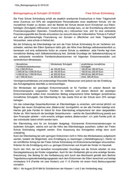 102a_Beitragsregelung SJ 2019-20 Beitragsregelung ab Schuljahr 2019/2020 Freie Schule Schöneberg Die Freie Schule Schöneberg erhält als staatlich anerkannte Ersatzschule in freier Trägerschaft einen Zuschuss von 93% der vergleichbaren Personalkosten einer staatlichen Schule. Um die monatlichen Kosten zu decken, wird der Betrieb der Schule derzeit durch Einnahmen aus Eltern- beiträgen (Schulgeld) mitfinanziert. Unsere Schule ermutigt dazu, an der Erschließung alternativer Finanzierungsquellen (Spenden, Crowdfunding etc.) mitzuwirken bzw. sich für eine veränderte Finanzierungspolitik des Senats einzusetzen (so versucht etwa die Volksinitiative "Schule in Freiheit" auf eine gleichberechtigte Finanzierung von Schulen in öffentlicher und freier Trägerschaft hinzuwirken, www.schule-in-freiheit.de). Bei der Erhebung der Elternbeiträge hat sich die Freie Schule Schöneberg für ein Verfahren ent- schieden, welches den Eltern Spielraum dafür gibt, die Höhe ihres Beitrags selbstverantwortlich zu bemessen und eine solidarische Kultur an unserer Schule zu etablieren. Jede Familie legt ihren monatlichen Beitrag nach Selbsteinschätzung fest. Zentrale Grundlage der Selbsteinschätzung ist das antizipierte monatliche Familienbruttoeinkommen mit folgenden Einkommensstufen und verbindlichem Mindestsatz: Monatliches Mindestsatz Schulgeld empfohlenes monatliches Familienbruttoeinkommen Schulgeld bis 2.500,00 Euro ab 100,00 Euro 100,00 bis 180,00 Euro 2.500,00 bis 4.000,00 Euro ab 150,00 Euro 150,00 bis 230,00 Euro 4.000,00 bis 7.000,00 Euro ab 200,00 Euro 200,00 bis 360,00 Euro ab 7.000,00 Euro ab 300,00 Euro mind. 300,00 Euro Vermögensverhältnisse und anderweitige finanzielle Ressourcen sind jedoch bei der Erstellung des Schulgeldgebots ebenfalls zu berücksichtigen. Der Mindestsatz der jeweiligen Einkommensstufe ist für Familien im unteren Bereich der Einkommenspanne vorgesehen, Familien im mittleren und oberen Bereich der jeweiligen Einkommensstufe sollten ihren monatlichen Beitrag entsprechend höher festlegen (empfohlenes monatliches Schulgeld). Der Elternbeitrag für das zweite Kind an der Schule kann 25% weniger betragen. Um das notwendige Gesamtaufkommen an Elternbeiträgen zu erreichen, wird einmal jährlich vor Beginn des neuen Schuljahres eine „Bieterrunde“ durchgeführt, an der alle Familien beteiligt sind. Hierbei gibt jede Familie ihr Gebot für ihren Elternbeitrag entsprechend der oben dargestellten Stufen ab. Wird hierdurch die benötigte Gesamtsumme – welche die Geschäftsführung jeweils aus dem Finanzplan ableitet – nicht erreicht, erfolgen weitere „Bieterrunden“, d.h. jede Familie prüft, ob das individuelle Gebot erhöht werden kann. Der Elternbeitrag wird für ein Schuljahr festgelegt. Gravierende Einkommensänderungen im laufenden Schuljahr, welche sich auf die Höhe des Elternbeitrages auswirken, sollten der Freien Schule Schöneberg mitgeteilt werden. Eine Anpassung des Schulgeldes erfolgt dann auch unterjährig. Kann der Elternbeitrag bei sehr geringem Einkommen nicht in Höhe des Mindestsatzes aufgebracht werden, besteht die Möglichkeit, eine Ermäßigung zu beantragen („Härtefallregelung“). Hierfür ist ein schriftlicher Antrag bei der Freien Schule Schöneberg mit Einkommensunterlagen einzureichen. Kriterien für die Ermäßigung sind u.a. geringes Einkommen und Anzahl der Kinder im Haushalt. Durch den Hort, der auf derselben konzeptionellen Grundlage wie die Schule arbeitet, ist eine Ganztagsbetreuung der Kinder vorgesehen. Auch für den Hortbetrieb gibt es eine anteilige Senats- finanzierung. Der Beitrag für die Hortbetreuung wird durch das Bezirksamt gemäß dem Berliner Tagesbetreuungskostenbeteiligungsgesetz nach dem Einkommen der Eltern berechnet und beträgt mindestens 9 € (Familie mit zwei Kindern) und 11 € (Familie mit einem Kind) Betreuungsanteil monatlich. NEU ! Ab August 2019 fällt für SchülerInnen der Klassen 1 und 2 der Hortbeitrag weg.