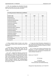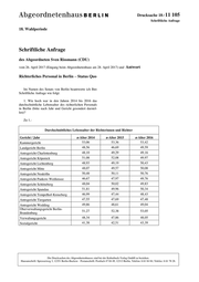 Abgeordnetenhaus Berlin – 18. Wahlperiode Drucksache 18 / 11 105 5. Wie viele Angehörige des richterlichen Personals wurden in den Jahren 2014 bis 2016 vorzeitig pensioniert (bitte nach Jahr und Gericht gesondert darstellen)? Zu 5.: Vorzeitig pensionierte Richterinnen und Richter Gericht / Jahr 2014 2015 2016 Kammergericht 1 4 0 Landgericht Berlin 2 2 3 Amtsgericht Charlottenburg 0 0 1 Amtsgericht Köpenick 0 0 0 Amtsgericht Lichtenberg 0 1 0 Amtsgericht Mitte 0 0 0 Amtsgericht Neukölln 0 0 0 Amtsgericht Pankow-Weißensee 0 0 0 Amtsgericht Schöneberg 0 0 0 Amtsgericht Spandau 1 1 0 Amtsgericht Tempelhof-Kreuzberg 0 0 0 Amtsgericht Tiergarten 0 0 3 Amtsgericht Wedding 1 1 0 Oberverwaltungsgericht Berlin- 0 0 1 Brandenburg Verwaltungsgericht 2 2 1 Sozialgericht 1 0 0 6. Waren sämtliche Berliner Gerichte in den Jahren 8. Liegen dem Senat Erkenntnisse dahingehend vor, 2014 bis 2016 in Bezug auf das richterliche Personal voll dass zwischen dem Krankenstand und der Ausstattung des ausgestattet? richterlichen Personals an Berliner Gerichten ein Zusam- menhang herzustellen ist? 7. Sofern Frage 6 verneint wird, durch welche Maß- nahmen soll zukünftig sichergestellt werden, dass die Zu 8.: Es liegen keine konkreten Informationen oder Berliner Gerichte bezüglich des richterlichen Personals Erkenntnisse zu einem Zusammenhang zwischen dem tatsächlich angemessen ausgestattet sind? Krankenstand und der Ausstattung des richterlichen Per- sonals an Berliner Gerichten vor. Zu 6. und 7.: Aufgrund der Größe des gesamten Stel- lenbestandes, des Umfangs der altersbedingten und sons- tigen Fluktuation sowie des Umstands, dass einige Stellen Berlin, den 12. Mai 2017 wegen einer Beurlaubung ohne Dienstbezüge aus haus- halts- und dienstrechtlichen Gründen nicht besetzt werden können, waren nicht immer alle Stellen besetzt. Der der- In Vertretung zeitige Ist-Zustand entspricht dem stellenplanmäßigen Soll-Zustand nahezu. Der Senat bemüht sich um zeitnahe M. Gerlach Besetzung freier Stellen. Senatsverwaltung für Justiz, Verbraucherschutz und Antidiskriminierung (Eingang beim Abgeordnetenhaus am 16. Mai 2017) 4