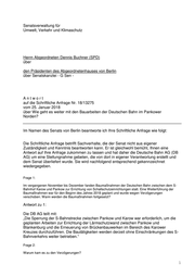 Senatsverwaltung für Umwelt, Verkehr und Klimaschutz Herrn Abgeordneten Dennis Buchner (SPD) über den Präsidenten des Abgeordnetenhauses von Berlin über Senatskanzlei - G Sen - Antwort auf die Schriftliche Anfrage Nr. 18/13275 vom 25. Januar 2018 über Wie geht es weiter mit den Bauarbeiten der Deutschen Bahn im Pankower Norden? Im Namen des Senats von Berlin beantworte ich Ihre Schriftliche Anfrage wie folgt: Die Schriftliche Anfrage betrifft Sachverhalte, die der Senat nicht aus eigener Zuständigkeit und Kenntnis beantworten kann. Er ist gleichwohl bemüht, Ihnen eine Antwort auf Ihre Anfrage zukommen zu lassen und hat daher die Deutsche Bahn AG (DB AG) um eine Stellungnahme gebeten, die von dort in eigener Verantwortung erstellt und dem Senat überliefert wurde. Sie wird nachfolgend entsprechend gekennzeichnet wiedergegeben. Frage 1: Im vergangenen November bis Dezember fanden Baumaßnahmen der Deutschen Bahn zwischen dem S- Bahnhof Karow und Pankow zur Errichtung von Schallschutzeinrichtungen statt. Eine Weiterführung der Baumaßnahmen war für den Beginn des Jahres 2018 geplant und wurde wegen Verzögerungen verschoben. Wann werden die Baumaßnahmen fortgesetzt? Antwort zu 1: Die DB AG teilt mit: „Die Sperrung der S-Bahnstrecke zwischen Pankow und Karow war erforderlich, um die geplanten Arbeiten zur Errichtung der Lärmschutzwand zwischen Pankow und Blankenburg und die Erneuerung von Brückenbauwerken im Bereich des Karower Kreuzes durchzuführen. Die Bautätigkeiten werden derzeit ohne Einschränkungen des S- Bahnverkehrs weiter betrieben.“ Frage 2: Warum kam es zu den Verzögerungen? 1