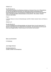 Antwort zu 2: Die DB AG teilt mit: „Der gestörte Bauablauf des Bahnbauvorhabens am Karower Kreuz ist im Wesentlichen auf die nicht genügende personelle und maschinelle Ressourcenausstattung der bauausführenden Firma und erforderliche Projektänderungen auf Grund nicht bekannter oder im Baufeld befindlicher Bestandskabel zurückzuführen. Alle anderen Arbeiten verlaufen planmäßig.“ Frage 3: In welchem Zeitraum ist erneut mit Einschränkungen und SEV im Bereich zwischen Karow und Pankow zu rechnen? Antwort zu 3: Die DB AG teilt mit: „Für die Fertigstellung der Brückenarbeiten am Karower Kreuz ist noch einmal eine 7,5 Wochen lange Sperrung der S-Bahnstrecke erforderlich. Die terminliche Einordnung der Sperrung ist gegenwärtig in Abstimmung und wird zeitnah kommuniziert.“ Berlin, den 06.02.2018 In Vertretung Jens-Holger Kirchner ................................ Senatsverwaltung für Umwelt, Verkehr und Klimaschutz 2