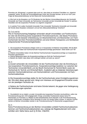 -2- Promotion als „Königsweg“; er gestand aber auch ein, dass diese an einzelnen Fakultäten nur „zögerlich umgesetzt“ werde. Da aber die Universitätsleitungen hinter dem Konzept stünden, sei es nur noch „eine Frage der Bewusstseinsbildung“ auf der Ebene der Hochschullehrenden. a.) Wie hoch ist die Akzeptanz von FH-Studenten bei den Berliner Universitätsprofessoren der Humboldt- Universität, der Freien Universität, der Technischen Universität und der Universität der Künste? In welchen Fakultäten wird die kooperative Promotion nur zögerlich umgesetzt? b.) In welcher Form wollen Humboldt-Universität, Freie Universität, Technische Universität und Universität der Künste diese Akzeptanz verbessern und auf eine „Bewusstseinsbildung“ hinwirken? Zu 2 a) und b): Wie im Hochschulvertrag festgelegt verhandeln aktuell Universitäten und Fachhochschu- len über die Einrichtung eines kooperativen Promotionszentrums. Ziel dieses Promotions- zentrums ist die bessere Unterstützung von Absolventeninnen und Absolventen von Fach- hochschulen bei ihren Promotionsverfahren und eine höhere Transparenz und Sichtbarkeit entsprechender Promotionsmöglichkeiten. 3. Die kooperativen Promotionen erfolgen nicht nur in Kooperation mit Berliner Universitäten. Mit der Berli- ner Universitäten haben die Fachhochschulen Kooperationsverträge geschlossen. Diese laufen zum Teil aus. a.) Welche Universitäten haben mit den Berliner Fachhochschulen Kooperationsverträge zur kooperativen Promotion geschlossen? b.) Welche Bedeutung haben die Kooperationsverträge aus Sicht der Fachhochschulen? c.) Besteht die Gefahr, dass diese nicht verlängert werden und wenn ja, warum? Zu 3.: a) Zurzeit verhandeln die Universitäten mit den Fachhochschulen über die Einrichtung ei- nes kooperativen Promotionszentrums. Kooperationsverträge bestehen nur zwischen der Technischen Universität Berlin und der Beuth-Hochschule für Technik Berlin sowie der Hochschule für Technik und Wirtschaft Berlin. Zusätzlich gibt es bilaterale Vereinbarungen zwischen Hochschullehrerinnen und Hochschullehrern und Promovierenden mit Fach- hochschulabschluss. b) Die Kooperationsverträge stellen für die Fachhochschulen einen Ermöglichungsrahmen dar. Wie stark dieser genutzt wird, hängt vom Interesse und Engagement Einzelner sowie von der jeweiligen Fachkultur ab. c) Seitens der Fachhochschulen sind keine Gründe bekannt, die gegen eine Verlängerung der Vereinbarungen sprechen. 4. Grundsätzlich ist es möglich, an jeder Universität eine kooperative Promotion durchzuführen, sofern die Promotionsordnung dem nicht entgegensteht. Einige universitäre Fachbereiche lassen keine FH- Absolventen zur Promotion zu. Möglich ist dies beispielsweise durch Klauseln in der Promotionsordnung, wonach Doktoranden mindestens sechs Semester an einer Uni studiert haben müssen. In welchen Fachbe- reichen an Berliner Universitäten werden in der Promotionsordnung FH-Absolventen ausgeschlossen? Zu 4.: Keine Promotionsordnung an den Berliner Universitäten schließt Fachhochschulabsolven- teninnen und Fachhochschulabsolventen aus, solange die Regelstudienzeit nicht unter- schritten wird. Siehe hierzu auch § 35 Abs. 3 BerlHG.