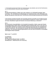 -4- 7. Wie bewertet der Senat das Problem der Hausberufungen, das entstünde, wenn sich die Fachhochschu- len den wissenschaftlichen Nachwuchs selbst heranbilden? Zu 7.: Die Berufungsverfahren in Berlin sind unter anderem in § 100 BerlHG geregelt. Nach § 100 Abs. 1 Nr. 4b BerlHG ist für Berufungen an Fachhochschulen eine mindestens drei- jährige Berufspraxis außerhalb einer Hochschule als Berufungsvoraussetzung erforderlich. 8. Wie bewerten Humboldt-Universität, Freie Universität, technische Universität und Universität der Künste unter dem Gesichtspunkt der Sicherung der wissenschaftlichen Qualität den in anderen Ländern praktizier- ten Ansatz, Dissertationen regulär einer externen und anonymen Bewertung zu unterziehen? Zu 8.: Die Technische Universität Berlin, die Humboldt-Universität zu Berlin sowie die Charité – Universitätsmedizin Berlin führen regelmäßig externe Bewertungen durch. Die Freie Uni- versität Berlin befindet sich aktuell in einem Diskussionsprozess über die Qualitätssiche- rung bei Promotionen. Die Universität der Künste hält externe Bewertungsverfahren für entbehrlich. Ein anonymes Bewertungsverfahren wird aus Sicht der Berliner Universitäten überwiegend kritisch bewertet. Berlin, den 17. Juli 2019 In Vertretung Steffen Krach Der Regierende Bürgermeister von Berlin Senatskanzlei - Wissenschaft und Forschung -