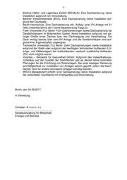4 - Berliner Hafen- und Lagerhaus GmbH (BEHALA): Eine Dachsanierung; keine Installation aufgrund von Verschattung. - Berliner Verkehrsbetriebe (BVG): Eine Dachsanierung; keine Installation auf- grund der Dachstatik. - Beuth Hochschule: Eine Dachsanierung inkl. Aufbau einer PV-Anlage mit 21 kWp (Inbetriebnahme 2017 siehe Beantwortung Frage 2). - Freie Universität (FU) Berlin: Fünf Dachsanierungen sowie Dachsanierung bei Gewächshäusern im Botanischen Garten. Keine Installation aufgrund von ge- ringer Größe eines Daches bzw. der Dachneigung und Verschattung. Ein Dach verfügt bereits über eine PV-Anlage und die Gewächshäuser sind auf- grund ihrer Eigenschaften ungeeignet. - Technische Universität (TU) Berlin: Zehn Dachsanierungen; keine Installation aufgrund der Statik oder aufgrund der benötigten technischen Aufbauten (Lüf- tungs- und Kälteanlagen) bei Institutsbauten, wodurch zusätzliche Aufbauten (PV) nicht möglich waren. - Vivantes – Netzwerk für Gesundheit GmbH: Aufgrund des Instandhaltungs- rückstaus und der Qualität der Dachflächen gibt es derzeit keine konkreten Planungen für die Errichtung von Solaranlagen. Bei einer etwaigen Sanierung wird Möglichkeit zur Installation von Anlagen jedoch geprüft, sofern die Dach- flächen nicht für andere technische Anlagen benötigt werden. - WISTA-Management GmbH: Eine Dachsanierung; keine Installation aufgrund der zerklüfteten Dachfläche mit Innengefälle und Verschattung. Berlin, den 24.08.2017 In Vertretung Christian R i c k e r t s .......................................................... Senatsverwaltung für Wirtschaft, Energie und Betriebe