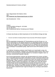 Zu 6.: Die Berliner Verwaltung muss ihren Bürgerinnen und Bürgern, der Wirtschaft aber auch ihren eigenen Mitarbeiterinnen und Mitarbeitern professionelle Dienstleistungen bei der Bereitstellung von Informations- und Kommunikationstechnik bieten. Innerhalb der Berliner Verwaltung sind zahlreiche Aufgabenbereiche geprägt von einer doku- mentenbasierten Sachbearbeitung. Diese manuellen Routinetätigkeiten binden Res- sourcen, die bei der Wahrnehmung fachlicher, wissensintensiver Aufgaben und vor allem für Beratung von Bürgerinnen und Bürger dringend benötigt werden. Eine sys- tematische Automatisierung von Arbeitsabläufen, eröffnet den Behörden die Möglich- keit, den Mitarbeitenden von zeitraubenden Tätigkeiten zu befreien und die Fokussie- rung auf Beratung von Bürgern zu legen. Berlin, den 23. Mai 2019 In Vertretung Sabine Smentek Senatsverwaltung für Inneres und Sport Seite 3 von 3