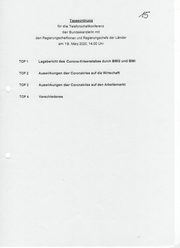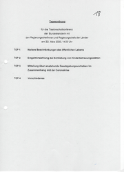 Tagesordnung für die Telefonschaltkonferenz der Bundeskanzlerin mit den Regierungschefinnen und Regierungschefs der Länder am 22. März 2020, 14.00 Uhr TOP 1 Weitere Beschränkungen des öffentlichen Lebens TOP 2 Entgeltfortzahlung bei Schließung von Kinderbetreuungsstätten TOP 3 Mitteilung über anstehende Gesetzgebungsvorhaben im Zusammenhang mit der Coronakrise TOP 4 Verschiedenes
