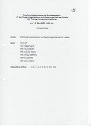 Tb Telefonschaltkonferenz der Bundeskanzlerin mit den Regierungschefinnen und Regierungschefs der Länder zum Thema Coronavirus-Infektionen am 19. März 2020, 14.00 Uhr -Teilnehmerliste- Länder: Die Regierungschefinnen und Regierungschefs aller 16 Länder. Bund: Chef BK StM Hoppenstedt BM Scholz (BMF) BM Seehofer (BMI) BM Altmaier (BMWi) BM Heil (BMAS) BM Spahn (BMG) stille Zuhörer BKAmt: . AL’in 1, AL’in 3, GL 12, Ref. 122
