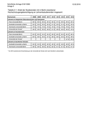 Schriftliche Anfrage S18/13383 12.02.2018 Anlage 2 Tabelle 2.1: Anteil der Studierenden mit in Berlin erworbener Hochschulzugangsberechtigung an Lehramtsstudierenden insgesamt Hochschule 2008 2009 2010 2011 2012 2013 2014 2015 2016 Lehramt an Integrierten Sekundarschulen und Gymnasien Freie Universität Berlin 58 % 56 % 56 % 55 % 56 % 57 % 58 % 59 % 60 % Humboldt-Universität zu Berlin 52 % 50 % 50 % 52 % 51 % 52 % 51 % 52 % 52 % Technische Universität Berlin 70 % 72 % 72 % 72 % 72 % 74 % 75 % 78 % 79 % 1 Universität der Künste 49 % 49 % 50 % 49 % 51 % 49 % 46 % 46 % 43 % Lehramt an Grundschulen Freie Universität Berlin 63 % 60 % 54 % 55 % 59 % 60 % 64 % 65 % 66 % Humboldt-Universität zu Berlin 60 % 58 % 56 % 57 % 58 % 56 % 55 % 60 % 58 % 1 Universität der Künste - - - - - - - 57 % 59 % Lehramt an beruflichen Schulen Humboldt-Universität zu Berlin 55 % 54 % 48 % 52 % 49 % 42 % 46 % 48 % 49 % Technische Universität Berlin 58 % 59 % 58 % 63 % 62 % 61 % 61 % 60 % 61 % 1 Vor 2015 wurde bei der Einschreibung an der Universität der Künste nicht nach Schulform unterschieden.