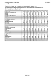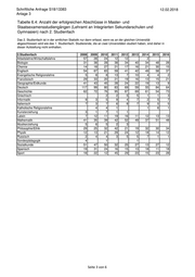 Schriftliche Anfrage S18/13383 12.02.2018 Anlage 3 Tabelle 6.3: Anzahl der erfolgreichen Abschlüsse in Master- und Staatsexamensstudiengängen (Lehramt an Integrierten Sekundarschulen und Gymnasien) nach 1. Studienfach 1.Studienfach 2008 2009 2010 2011 2012 2013 2014 2015 2016 Arbeitslehre/Wirtschaftslehre 7 22 11 18 20 29 36 24 30 Biologie 61 47 44 32 37 29 34 62 33 Chemie 14 16 22 20 19 20 25 19 18 Darstellendes Spiel/Schulspiel 2 2 2 3 Deutsch 176 170 135 105 86 52 47 58 46 Englisch 85 94 46 57 51 50 42 46 59 Evangelische Religionslehre 1 3 1 9 4 1 Französisch 26 32 27 25 14 24 31 32 35 Geographie/Erdkunde 57 53 35 18 15 11 5 8 8 Geschichte 103 105 111 111 70 52 43 51 47 Griechisch 1 2 3 3 3 1 3 4 3 Informatik 16 6 6 6 9 9 4 8 15 Italienisch 1 3 1 3 6 5 2 Katholische Religionslehre 1 Kunsterziehung 24 41 42 23 13 16 21 12 23 Latein 8 15 13 14 26 24 22 13 16 Mathematik 38 22 41 45 51 40 48 46 41 Musikerziehung 34 35 23 40 23 25 31 42 20 Philosophie/Ethik 2 2 2 7 3 Physik 4 10 8 9 6 19 9 10 14 Russisch 4 6 2 6 7 6 2 3 3 Sonderpädagogik 132 112 83 88 80 69 63 66 56 Sozialkunde 41 42 46 40 36 38 31 41 31 Spanisch 14 14 17 9 12 14 22 22 20 Sport 54 60 57 45 33 36 37 41 17 Seite 2 von 6