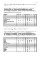 Schriftliche Anfrage S18/13383 12.02.2018 Anlage 3 Tabelle 6.5: Anzahl der erfolgreichen Abschlüsse in Bachelorstudiengängen (Lehramt an Grundschulen) Die fachliche Ausbildung für das Lehramt an Grundschulen erfolgte bisher in zwei Lernbereichen im Rahmen des bildungswissenschaftlichen Studienanteils sowie in einem wissenschaftlichen Fach, das als Teilstudiengang (Kombinationsfach) studiert wurde. Statistisch erfasst wurde nur das wissenschaftliche Fach. Dieses wissenschaftliche Fach wurde in der Regel als 2. Fach studiert und deshalb nur für die Studierenden erfasst, die das 2. Fach an der gleichen Universität wie das 1. Fach studiert haben. Die in der Tabelle enthaltenen Fallzahlen bilden somit nur einen begrenzten Teil der Fachausbildung ab. Insbesondere die Fächer Musik und Kunst sind – bis auf Altfälle der Staatsexamensabschlüsse – nicht abgebildet. Studienfach 2008 2009 2010 2011 2012 2013 2014 2015 2016 Biologie 6 15 12 9 17 3 7 1 4 Chemie 1 Deutsch 17 13 29 20 25 23 38 57 49 Englisch 4 4 12 17 21 17 15 26 25 Französisch 1 1 6 4 2 1 3 4 2 Geographie/Erdkunde 4 3 4 2 1 4 2 Geschichte 4 11 19 12 11 18 15 30 15 Sachunterricht/Naturwissenschaften 28 28 Mathematik 4 14 9 12 5 10 3 12 4 Physik 2 1 Sozialkunde 2 1 9 3 2 3 2 7 10 Spanisch 1 1 1 1 1 1 Sport 7 10 7 11 6 9 6 8 Tabelle 6.6: Anzahl der erfolgreichen Abschlüsse in Master- und Staatsexamensstudiengängen (Lehramt an Grundschulen) Die fachliche Ausbildung für das Lehramt an Grundschulen erfolgte bisher in zwei Lernbereichen im Rahmen des bildungswissenschaftlichen Studienanteils sowie in einem wissenschaftlichen Fach, das als Teilstudiengang (Kombinationsfach) studiert wurde. Statistisch erfasst wurde nur das wissenschaftliche Fach. Dieses wissenschaftliche Fach wurde in der Regel als 2. Fach studiert und deshalb nur für die Studierenden erfasst, die das 2. Fach an der gleichen Universität wie das 1. Fach studiert haben. Die in der Tabelle enthaltenen Fallzahlen bilden somit nur einen begrenzten Teil der Fachausbildung ab. Insbesondere die Fächer Musik und Kunst sind – bis auf Altfälle der Staatsexamensabschlüsse – nicht abgebildet. Studienfach 2008 2009 2010 2011 2012 2013 2014 2015 2016 Biologie 2 7 17 18 18 12 7 7 3 Chemie 1 1 Deutsch 1 4 34 41 33 28 30 44 35 Englisch 7 4 8 20 15 20 17 19 18 Französisch 1 3 4 4 1 4 2 1 Geographie/Erdkunde 3 4 6 6 5 2 3 Geschichte 2 4 21 22 15 17 15 20 20 Sachunterricht/Naturwissenschaften 6 13 Kunsterziehung 3 2 Mathematik 3 9 14 21 9 9 8 9 4 Musikerziehung 2 2 1 Physik 1 1 Sozialkunde 8 13 5 3 1 4 5 Spanisch 1 2 1 Sport 2 11 7 16 10 10 9 5 5 Seite 4 von 6