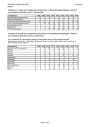 Schriftliche Anfrage S18/13383 12.02.2018 Anlage 3 Tabelle 6.1: Anzahl der erfolgreichen Abschlüsse in Bachelorstudiengängen (Lehramt an Integrierten Sekundarschulen und Gymnasien) nach 1. Studienfach 1.Studienfach 2008 2009 2010 2011 2012 2013 2014 2015 2016 Arbeitslehre/Wirtschaftslehre 7 15 14 33 34 68 46 46 37 Biologie 5 41 37 34 36 49 56 50 53 Chemie 2 9 14 28 30 15 16 29 12 Deutsch 2 38 59 65 44 53 60 56 80 Englisch 3 42 52 51 57 44 68 62 67 Evangelische Religionslehre 1 2 2 4 1 Französisch 13 15 21 40 28 34 32 20 Geographie/Erdkunde 14 9 9 11 12 13 8 9 Geschichte 7 49 50 52 32 46 46 53 58 Griechisch 1 1 2 4 2 7 3 7 Informatik 5 8 4 4 4 7 7 6 Italienisch 2 3 4 6 9 3 5 5 Kunsterziehung 4 5 12 19 22 25 30 23 29 Latein 1 17 18 20 24 21 16 30 18 Mathematik 28 44 53 33 53 47 61 36 Musikerziehung 8 21 16 17 45 30 49 40 35 Philosophie/Ethik 3 5 3 4 2 Physik 26 8 18 11 13 18 21 13 Russisch 4 6 5 4 3 4 6 4 Sonderpädagogik 44 53 58 82 65 50 62 82 Sozialkunde 20 12 40 70 37 54 40 41 40 Spanisch 11 13 21 14 30 17 20 24 Sport 15 31 35 23 42 34 35 39 Tabelle 6.2: Anzahl der erfolgreichen Abschlüsse in Bachelorstudiengängen (Lehramt an Integrierten Sekundarschulen und Gymnasien) nach 2. Studienfach Das 2. Studienfach ist in der amtlichen Statistik nur dann erfasst, wenn es an der gleichen Universität abgeschlossen wird wie das 1. Studienfach. Studierende, die an zwei Universitäten studiert haben, sind daher in dieser Aufstellung nicht enthalten. 2.Studienfach 2008 2009 2010 2011 2012 2013 2014 2015 2016 Biologie 30 35 45 51 34 39 43 40 Chemie 36 31 19 16 20 25 27 23 Deutsch 5 49 58 78 55 77 67 69 57 Englisch 1 38 48 39 52 48 41 62 68 Evangelische Religionslehre 2 8 7 4 2 3 4 8 Französisch 5 7 28 16 18 24 32 23 31 Geographie/Erdkunde 9 7 20 14 12 10 3 9 Geschichte 3 57 65 71 64 75 63 88 78 Griechisch 1 2 2 9 1 1 2 3 2 Informatik 7 4 6 6 8 8 11 12 Italienisch 2 6 5 7 9 2 5 4 Katholische Religionslehre 1 6 5 5 5 Latein 8 8 15 12 14 20 15 20 Mathematik 3 29 40 69 40 51 53 54 44 Musikerziehung 1 1 Philosophie/Ethik 11 15 32 35 44 44 48 44 Physik 1 17 26 17 12 15 20 22 24 Russisch 5 9 7 5 3 4 1 Sozialkunde 3 16 11 33 19 31 28 20 27 Spanisch 1 10 13 15 23 22 21 19 20 Sport 12 18 14 21 18 27 29 22 Seite 1 von 6
