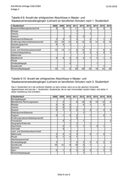 Schriftliche Anfrage S18/13383 12.02.2018 Anlage 3 Tabelle 6.9: Anzahl der erfolgreichen Abschlüsse in Master- und Staatsexamensstudiengängen (Lehramt an beruflichen Schulen) nach 1. Studienfach 1.Studienfach 2008 2009 2010 2011 2012 2013 2014 2015 2016 Bautechnik/Bauingenieurtechnik 9 9 7 11 4 2 4 3 3 Biologie 1 Chemie 1 1 Deutsch 2 1 2 Elektrotechnik/Elektronik 2 3 1 4 2 1 1 3 Ernährung/Lebensmittelwissenschaft 22 24 10 6 12 8 14 9 16 Gestaltungstechnik 9 4 1 Informatik 1 Land- und Gartenbauwissenschaft 13 14 11 6 14 5 1 6 2 Landschaftsgestaltung 1 7 2 4 4 2 2 Mathematik 1 Metalltechnik 9 6 3 2 2 7 3 1 5 Physik 1 Sonderpädagogik 2 1 Sozialkunde 1 1 Wirtschaftspädagogik 10 11 6 20 26 16 19 24 20 Tabelle 6.10: Anzahl der erfolgreichen Abschlüsse in Master- und Staatsexamensstudiengängen (Lehramt an beruflichen Schulen) nach 2. Studienfach Das 2. Studienfach ist in der amtlichen Statistik nur dann erfasst, wenn es an der gleichen Universität abgeschlossen wird wie das 1. Studienfach. Studierende, die an zwei Universitäten studiert haben, sind daher in dieser Aufstellung nicht enthalten. 2.Studienfach 2008 2009 2010 2011 2012 2013 2014 2015 2016 Berufspädagogik 1 Betriebliches Rechnungswesen 1 3 1 9 18 8 10 13 9 Biologie 5 8 2 4 1 2 Chemie 5 9 2 1 Deutsch 9 7 5 2 7 2 1 4 3 Elektrotechnik/Elektronik 1 Englisch 6 1 2 2 1 2 1 Ernährung/Lebensmittelwissenschaft 3 Französisch 2 1 1 2 Geographie/Erdkunde 1 1 1 Geschichte 2 1 1 1 1 2 1 Informatik 3 Land- und Gartenbauwissenschaft 1 1 Mathematik 3 5 4 4 2 1 2 1 Physik 3 1 2 1 Rechtswissenschaft 1 Sonderpädagogik 2 1 2 4 2 2 2 3 Sozialkunde 34 21 9 16 3 1 Spanisch 1 1 1 1 Sport 6 1 3 3 5 5 1 4 2 Wirtschaftspädagogik 1 Seite 6 von 6