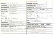 ep r„~ Zuname Siebert - Vornamen Geburtsort Beruf -- Dienstgrad Gest./ Gef. am Standesamt Deutsche [ Sarg Nr. -- Stabs~f<Cin-\t 945 Bergedorf Grabbrief 'l~rab~»e: Leiche Anschrift der Angehörigen DI• C1ubml1te u111erliegf nlCJit den Bestlmmung~n dt~ Grabt r!)JS?tas. Es O•llen-dlt VorsChrllten ffos G··tetlts Ober die Gem11nd1frleaMf11 uod do: Ouielridiflf lhobudnu 't· Bezirk t.. F~1t!r Nr.\ l Reihe - 30 Exhumiert am von nach Todesursache beigesetzt als ---- - nbek<rnn t ~ 4.4. -- 1 Sterbe- Reg. Nr. 2 1 . 1 0. :1 9 19 ii Nationalität In - - Cl ementine Geburtsdatum - - Kriegsgr. Liste Nr. utJ ')6 ,:.., Nr. ~_g2_ .. ll6 (ll l- Gräb crgese12 voa t. 7 1 ~~~ Grabzeichen : Kreuz Stele öffentl. gepflegtes Grab ja / nein Bemerkungen: Platte Dein Fr.Bergedoif__ 11. -