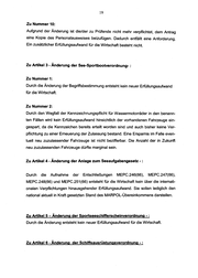 19 Zu Nummer 10: Aufgrund der Änderung ist die/der zu Prüfende nicht mehr verpflichtet, dem Antrag eine Kopie des Personalausweises beizufügen. Dadurch entfällt eine Anforderung. Ein zusätzlicher Erfüllungsaufwand für die Wirtschaft besteht nicht. Zu Artikel 3 - Änderung der See-Sportbootverordnung- : Zu Nummer 1: Durch die Änderung der Begriffsbestimmung entsteht kein neuer Erfüllungsaufwand für die Wirtschaft. Zu Nummer 2: Durch den Wegfall der Kennzeichnungspflicht für Wassermotorräder in den benann- ten Fällen wird kein Erfüllungsaufwand hinsichtlich der vorhandenen Fahrzeuge ein- gespart, da die Kennzeichen bereits erteilt worden sind und auch bisher keine Ver- pflichtung zu einer Erneuerung der Zulassung bestand. Eine Ersparnis im Falle even- tuell neu zuzulassender Fahrzeuge ist nicht bezifferbar. Die Anzahl der in Zukunft neu zuzulassenden Fahrzeuge dürfte marginal sein. Zu Artikel 4 - Änderung der Anlage zum Seeaufgabengesetz - : Durch die Aufnahme der· Entschließungen MEPC.246(66), MEPC.247(66), MEPC.248(66) und MEPC.251 (66) entsteht für die Wirtschaft kein über die internati- onalen Verpflichtungen hinausgehender Erfüllungsaufwand. Sie sollen lediglich den national aktuell in Kraft gesetzten Stand des MARPOL-Übereinkommens darstellen. Zu Artikel 5 - Änderung der Sportseeschifferscheinverordnung - : Durch die Änderung entsteht kein neuer Erfüllungsaufwand für die Wirtschaft. Zu Artikel 6 - Änderung der Schiffsausrüstungsverordnung - :
