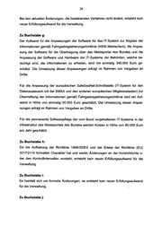 26 Bei den aktuellen Änderungen, die bestehenden Verfahren nicht ändert, entsteht kein neuer Erfünungsaufwand für die Verwaltung. Zu Buchstabe g: Der Aufwand für die Anpassungen der Software für das IT-System zur Abgabe der Informationen gemäß Fahrgastregistrierungsrichtlinie (NSW-Meldeclient), die Anpas- sung der Software für die Übertragung über das Meldeportal des Bundes und die Anpassung der Software und Hardware der IT-Systeme der Behörden, welche be- rechtigt sind, die Informationen zu erheben, wird mit einmalig 345.000 Euro ge- schätzt. Die Umsetzung dieser Anpassungen erfolgt im Rahmen von Vergaben an Dritte. Für die Anpassung der europäischen SafeSeaNet-Schnittstelle (IT-System für den Datenaustausch mit der EMSA und den anderen europäischen Mitgliedsstaaten) zur Übermittlung der Informationen gemäß Fahrgastregistrierungsrichtlinie wird ein Auf- wand in Höhe von einmalig 50.000 Euro geschätzt. Die Umsetzung dieser Anpas- sungen erfolgt im Rahmen von Vergaben an Dritte. Für die permanente Softwarepflege der vom Bund vorgehaltenen IT-Systeme in der Infrastruktur des Meldeportals des Bundes werden Kosten in Höhe von 80.000 Euro pro Jahr geschätzt. · Zu Buchstabe h: Da die Aufhebung der Richtlinie 1999/35/EG und der Erlass der Richtlinie (EU) 2017/2110 formellen Charakter hat und weder Änderungen an der Kontrolldichte o- der den Kontrollintervallen vorsieht, entsteht kein neuer Erfüllungsaufwand für die Verwaltung. Zu Buchstabe i: Es handelt sich um formelle Änderungen, es entsteht kein neuer Erfüllungsaufwand für die Verwaltung. Zu Buchstabe j: