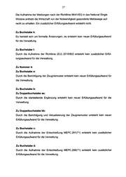 27 Die Aufnahme der Meldungen nach der Richtlinie 98/41 /EG in das National Single Window enthebt die Wirtschaft von der Notwendigkeit gesonderte Meldewege auf- recht zu erhalten. Ein zusätzlicher Erfüllungsaufwand entsteht nicht. Zu Buchstabe k: Es handelt sich um formelle Änderungen, es entsteht kein neuer Erfüllungsaufwand für die Verwaltung. Zu Buchstabe 1: Durch die Aufnahme der Richtlinie (EU) 2016/802 entsteht kein zusätzlicher Erfül- lungsaufwand für die Verwaltung. Zu Nummer4: Zu Buchstabe a: Durch die Berichtigung der Zeugnismuster entsteht kein neuer Erfüllungsaufwand für die Verwaltung. Zu Buchstabe b: Zu Doppelbuchstabe aa: Durch die klarstellende Ergänzung entsteht kein neuer Erfüllungsaufwand für die Verwaltung. Zu Doppelbuchstabe bb: Durch die Berichtigung und Aktualisierung der Zeugnismuster entsteht kein neuer Erfüllungsaufwand für die Verwaltung. Zu Buchstabe c: Durch die Aufnahme der Entschließung MEPC.291 (71) entsteht kein zusätzlicher Erfüllungsaufwand für die Verwaltung. Zu Buchstabe d: Durch die Aufnahme der Entschließung MEPC.289(71) entsteht kein zusätzlicher Erfüllungsaufwand für die Verwaltung.