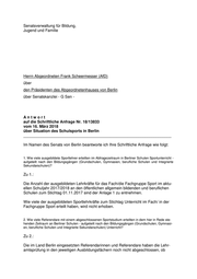 Drucksache 18 / 13 833 Schriftliche Anfrage 18. Wahlperiode Schriftliche Anfrage des Abgeordneten Frank Scheermesser (AfD) vom 16. März 2018 (Eingang beim Abgeordnetenhaus am 20. März 2018) zum Thema: Situation des Schulsports in Berlin und Antwort vom 09. April 2018 (Eingang beim Abgeordnetenhaus am 11. Apr. 2018) Die Drucksachen des Abgeordnetenhauses sind bei der Kulturbuch-Verlag GmbH zu beziehen. Hausanschrift: Sprosserweg 3, 12351 Berlin-Buckow · Postanschrift: Postfach 47 04 49, 12313 Berlin, Telefon: 6 61 84 84; Telefax: 6 61 78 28.
