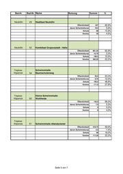 Bezirk Bad-Nr. Name Nutzung Summe % Neukölln 49 Stadtbad Neukölln Öffentlichkeit 347 62,9% davon Schwimmkurse 19,5 5,6% Schule 88 15,9% Vereine 25 4,5% Neukölln 52 Kombibad Gropiusstadt - Halle Öffentlichkeit 801,25 62,9% davon Schwimmkurse 15,75 2,0% Schule 190,5 15,0% Vereine 282,25 22,2% Treptow- Schwimmhalle Köpenick 54 Baumschulenweg Öffentlichkeit 93,5 23,3% davon Schwimmkurse 9,75 10,4% Schule 195,5 48,8% Vereine 111,5 27,8% Treptow- Kleine Schwimmhalle Köpenick 60 Wuhlheide Öffentlichkeit 142,5 96,0% davon Schwimmkurse 7,5 5,3% Schule 0 0,0% Vereine 6 4,0% Treptow- Köpenick 61 Schwimmhalle Allendeviertel Öffentlichkeit 318,75 59,9% davon Schwimmkurse 4,5 1,4% Schule 96 18,0% Vereine 117,25 22,0% Seite 5 von 7