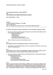 Senatsverwaltung für Inneres und Sport Frau Abgeordnete Nicole Ludwig (GRÜNE) über den Präsidenten des Abgeordnetenhauses von Berlin über Senatskanzlei - G Sen - Antwort auf die Schriftliche Anfrage Nr. 18/14883 vom 27. April 2018 über Zur Situation der Schwimmkurse in den Berliner Bäder Betrieben ----------------------------------------------------------------------------------------------------------------- Im Namen des Senats von Berlin beantworte ich Ihre Schriftliche Anfrage wie folgt: 1. Wie viel von Hundert der eigentlich geplanten Wasserzeit bei den Berliner Bäder Betrieben entfie- len in den letzten drei Monaten auf das - öffentliche Schwimmen, - Schulschwimmen, - Vereinsschwimmen, - privat angebotene Schwimmkurse, - Schwimmkurse der Berliner Bäder Betriebe? (Bitte nach Bezirken sowie den einzelnen Bädern auflisten.) Zu 1.: Die Angaben können der beigefügten Anlage 1 entnommen werden. 2. Welche Bäder der Berliner Bäder Betriebe waren in den vergangenen drei Monaten wann und aus welchem Grund geschlossen? Zu 2.: Informationen hierzu können der beigefügten Anlage 2 entnommen werden. Die An- gaben beziehen sich auf den Zeitraum Februar 2018 bis April 2018. 3. Wie viel von Hundert der eigentlich geplanten Öffnungszeiten fielen im entsprechenden Zeitraum im jeweiligen Bad dadurch weg - für öffentliches Schwimmen, - für Schulschwimmen, - für Vereinsschwimmen, - für privat angebotene Schwimmkurse, - für Schwimmkurse der Berliner Bäder Betriebe? Zu 3.: Nach Aussage der Berliner Bäder-Betriebe (BBB) ist für eine derartige differenzierte Darstellung eine umfangreiche und zeitintensive Datenauswertung erforderlich, wel- che im Rahmen der Beantwortung der Schriftlichen Anfrage nicht geleistet werden kann. Festzuhalten ist jedoch, dass im I. Quartal 2018 insgesamt 97 Prozent der ge- Seite 1 von 4