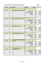 Wasserverteilung 2018 nach Bahnstunden pro Woche Anlage 1 Bezirk Bad-Nr. Name Nutzung Summe % Mitte 1 Stadtbad Mitte "James Simon" Öffentlichkeit 770 75,9% davon Schwimmkurse 12 1,6% Schule 102 10,1% Vereine 142 14,0% Mitte 2 Schwimmhalle Fischerinsel Öffentlichkeit 323,5 68,2% davon Schwimmkurse 7,5 2,3% Schule 71,25 15,0% Vereine 79,25 16,7% Mitte 4 Stadtbad Tiergarten Öffentlichkeit 672,5 71,1% davon Schwimmkurse 11,25 1,7% Schule 92 9,7% Vereine 181,5 19,2% Mitte 9 Kombibad Seestraße - Halle Öffentlichkeit 672,75 50,5% davon Schwimmkurse 6 0,9% Schule 268,75 20,2% Vereine 389,5 29,3% Schwimmhalle Thomas-Mann- Pankow 11 Straße Öffentlichkeit 36 8,7% davon Schwimmkurse 0 0,0% Schule 228 54,9% Vereine 151 36,4% Schwimmhalle Ernst- Pankow 12 Thälmann-Park Öffentlichkeit 507,75 97,3% davon Schwimmkurse 15,25 3,0% Schule 0 0,0% Vereine 14,25 2,7% Seite 1 von 7