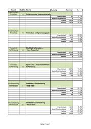 Bezirk Bad-Nr. Name Nutzung Summe % Charlottenburg- Wilmersdorf 23 Forumbad Olympiastadion Öffentlichkeit 0 0,0% davon Schwimmkurse 0 0,0% Schule 334,5 48,8% Vereine 351,5 51,2% 686 Spandau 26 Stadtbad Spandau Nord Öffentlichkeit 165 54,5% davon Schwimmkurse 4,5 2,7% Schule 100 33,0% Vereine 38 12,5% 303 Spandau 28 Kombibad Spandau Süd - Halle Öffentlichkeit 773 65,3% davon Schwimmkurse 13,5 1,7% Schule 229,5 19,4% Vereine 181,5 15,3% Charlottenburg- Wilmersdorf 29 Stadtbad Wilmersdorf I Öffentlichkeit 593,5 97,4% davon Schwimmkurse 18 3,0% Schule 0 0,0% Vereine 16 2,6% 609,5 Charlottenburg- Wilmersdorf 30 Stadtbad Wilmersdorf II Öffentlichkeit 36 7,2% davon Schwimmkurse 0 0,0% Schule 229 45,9% Vereine 234,25 46,9% Steglitz- Zehlendorf 34 Schwimmhalle Hüttenweg Öffentlichkeit 153 29,6% davon Schwimmkurse 7,5 4,9% Schule 175,75 34,0% Vereine 187,76 36,4% Seite 3 von 7
