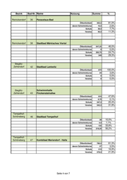 Bezirk Bad-Nr. Name Nutzung Summe % Friedrichshain- Kreuzberg 14 Schwimmhalle Holzmarktstraße Öffentlichkeit 51 12,1% davon Schwimmkurse 6 11,8% Schule 223,5 53,0% Vereine 147,5 35,0% Friedrichshain- Kreuzberg 15 Wellenbad am Spreewaldplatz Öffentlichkeit 613,75 82,9% davon Schwimmkurse 16,5 2,7% Schule 51 6,9% Vereine 75,25 10,2% Tempelhof- Stadtbad Schöneberg - Schöneberg 18 Hans Rosenthal Öffentlichkeit 570,5 99,6% davon Schwimmkurse 34,5 6,0% Vereine 0 0,0% Tempelhof- Sport- und Lehrschwimmhalle Schöneberg 19 Schöneberg Öffentlichkeit 222,75 16,9% davon Schwimmkurse 6,75 3,0% Schule 328,5 24,9% Vereine 768 58,2% Charlottenburg- Stadtbad Charlottenburg Wilmersdorf 21 - Alte Halle Öffentlichkeit 269 92,1% davon Schwimmkurse 8,25 3,1% Schule 0 0,0% Vereine 23 7,9% Charlottenburg- Stadtbad Charlottenburg Wilmersdorf 22 - Neue Halle Öffentlichkeit 497,5 43,2% davon Schwimmkurse 9,75 2,0% Schule 428 37,2% Vereine 226,5 19,7% Seite 2 von 7