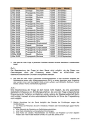 Zähldelikt Deliktsart Ortsteil PLZ Jahr Monat § 303 StGB sonstige Neukölln 12049 2018 März § 86a StGB Propaganda Neukölln 12055 2018 März § 185 StGB sonstige Neukölln 12055 2018 März § 130 StGB sonstige Buckow 12349 2018 März § 303 StGB sonstige Britz 12359 2018 März § 185 StGB sonstige Britz 12359 2018 März § 86a StGB Propaganda Neukölln 12047 2018 September § 86a StGB Propaganda Neukölln 12049 2018 September § 130 StGB sonstige Neukölln 12049 2018 September § 86a StGB Propaganda Neukölln 12049 2018 September § 86a StGB Propaganda Neukölln 12053 2018 September § 86a StGB Propaganda Neukölln 12053 2018 September § 86a StGB Propaganda Neukölln 12053 2018 September § 86a StGB Propaganda Neukölln 12059 2018 September § 86a StGB Propaganda Britz 12349 2018 September § 86a StGB Propaganda Gropiusstadt 12351 2018 September § 224 StGB Gewalt Buckow 12351 2018 September § 86a StGB Propaganda Gropiusstadt 12353 2018 September § 86a StGB Propaganda Gropiusstadt 12353 2018 September § 86a StGB Propaganda Rudow 12355 2018 September § 306a StGB Gewalt Buckow 12357 2018 September § 86a StGB Propaganda Buckow 12359 2018 September 5. Wie viele der unter Frage 4 genannten Straftaten betrafen einzelne Betroffene in wiederholtem Maße? Zu 5.: Die Beantwortung der Frage ist dem Senat nicht möglich, da die Daten von Geschädigten nach der Erfassung eines Falles im KPMD-PMK aus datenschutzrechtlichen Gründen anonymisiert werden. 6. Wie viele der unter Frage 4 genannten Ermittlungsverfahren zu den einzelnen Straftaten der Deliktbereiche kamen nach Strafprozessordnung (StPO) zu einem Abschluss, einer Einstellung oder werden immer noch durchgeführt (bitte einzeln auflisten nach Zähldelikt, Deliktsart, Tatzeit, Straße, Ortsteil, Thema und Bearbeitungsstand)? Zu 6.: Eine Beantwortung der Frage ist dem Senat nicht möglich, da eine gesonderte statistische Erfassung von Ermittlungsverfahren, die eine der Frage entsprechende Eingrenzung der Verfahren ermöglichen würde, seitens der Staatsanwaltschaft Berlin nicht erfolgt. Insoweit ist eine automatisierte Recherche im Sinne der Fragestellung nicht möglich. 7. Welche Kenntnisse hat der Senat bezüglich des Standes der Ermittlungen wegen des Veröffentlichens a. von Fotos von Personen, die sich in Initiativen, Parteien oder Veranstaltungen gegen Rechts engagieren, b. einer Übersicht der Standorte von Geflüchtetenunterkünften, c. einer Karte mit jüdischen und israelischen Einrichtungen, d. einer Karte von Lokalen, Räumlichkeiten von Parteien und Projekten auf einer digitalen Präsenz der Freien Kräfte Neukölln (FKNK) im Laufe des Jahres 2016? Seite 20 von 24