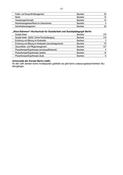 -22- Public- und Nonprofit-Management Bachelor 29 Recht Bachelor 10 Verwaltungsinformatik Bachelor 10 Rechtsmanagement/Recht im Unternehmen Bachelor 4 Sicherheitsmanagement Bachelor 29 „Alice-Salomon“-Hochschule für Sozialarbeit und Sozialpädagogik Berlin Soziale Arbeit Bachelor 178 Soziale Arbeit - BASA, Online-Fernstudiengang Bachelor 116 Erziehung und Bildung im Kindesalter Bachelor 3 Erziehung und Bildung im Kindesalter (berufsintegrierend) Bachelor 79 Gesundheits- und Pflegemanagement Bachelor 127 Physiotherapie/Ergotherapie (primärqualifizierend) Bachelor 3 Physiotherapie/Ergotherapie (additiv) Bachelor 14 Physiotherapie/Ergotherapie (dual) Bachelor 6 Universität der Künste Berlin (UdK) An der UdK werden keine Vorabquoten gebildet (es gibt keine zulassungsbeschränkten Stu- diengänge).