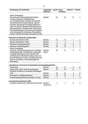 -20- Mathematik (Lehramt Grundschule) Bachelor 1 Psychologie Bachelor 62 Rechtswissenschaft Staatsexamen 21 Rehabilitationspädagogik Bachelor 31 Rehabilitationswissenschaften Bachelor 12 Rehabilitationswissenschaften mit dem Schwerpunkt Gebärdensprach- und Audiopädagogik Bachelor 3 Sachunterricht (Lehramt Grundschule) Bachelor 12 Sonderpädagogik Bachelor 28 Sonderpädagogik (Lehramt Grundschule) Bachelor 30 Sonderpädagogik mit den Fachrichtungen Gebärdensprachpädagogik/ Hören und Kommunikation Bachelor 4 Sonderpädagogik mit den Fachrichtungen Gebärdensprachpädagogik/ Hören und Kommunikation (Lehramt Grundschule) Bachelor 2 Sozialwissenschaften Bachelor 14 Volkswirtschaftslehre Bachelor 3 Wirtschaftspädagogik (Wirtschaft und Verwaltung) Bachelor 26 Sportwissenschaft Bachelor 12 Technische Universität Berlin Arbeitslehre (Lehramt) Bachelor 15 Architektur Bachelor 26 Bauingenieurwesen Bachelor 21 Biotechnologie Bachelor 12 Brauerei- und Getränketechnologie Bachelor 9 Chemieingenieurwesen Bachelor 2 Economics Bachelor 8 Energie- und Prozesstechnik Bachelor 16 Ernährung/Lebensmittelwissenschaft (Lehramt) Bachelor 17 Kultur und Technik/Kunstwissenschaft Bachelor 3 Kultur und Technik/Philosophie Bachelor 5 Kultur und Technik/Sprache und Kommunikation Bachelor 3 Kultur und Technik/Wissenschafts- und Technikgeschichte Bachelor 3 Landschaftsarchitektur Bachelor 7 Lebensmittelchemie Staatsexamen 4 Lebensmitteltechnologie Bachelor 24 Maschinenbau Bachelor 59 Medieninformatik Bachelor 3 Nachhaltiges Management Bachelor 18 Ökologie und Umweltplanung Bachelor 10 Physikalische Ingenieurwissenschaft Bachelor 2 Soziologie technikwissenschaftlicher Richtung Bachelor 8 Stadt- und Regionalplanung Bachelor 14 Verkehrswesen Bachelor 22 Wirtschaftsinformatik Bachelor 23 Wirtschaftsingenieurwesen Bachelor 41 Charité - Universitätsmedizin Berlin Gesundheitswissenschaften Bachelor 45