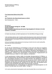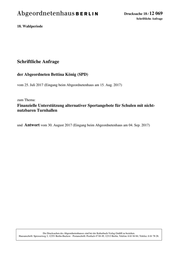 Drucksache 18 / 12 069 Schriftliche Anfrage 18. Wahlperiode Schriftliche Anfrage der Abgeordneten Bettina König (SPD) vom 25. Juli 2017 (Eingang beim Abgeordnetenhaus am 15. Aug. 2017) zum Thema: Finanzielle Unterstützung alternativer Sportangebote für Schulen mit nicht- nutzbaren Turnhallen und Antwort vom 30. August 2017 (Eingang beim Abgeordnetenhaus am 04. Sep. 2017) Die Drucksachen des Abgeordnetenhauses sind bei der Kulturbuch-Verlag GmbH zu beziehen. Hausanschrift: Sprosserweg 3, 12351 Berlin-Buckow · Postanschrift: Postfach 47 04 49, 12313 Berlin, Telefon: 6 61 84 84; Telefax: 6 61 78 28.