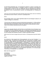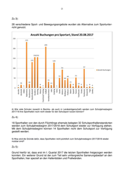 Senatsverwaltung für Bildung, Jugend und Familie Frau Abgeordnete Bettina König (SPD) über den Präsidenten des Abgeordnetenhauses von Berlin über Senatskanzlei - G Sen - Antwort auf die Schriftliche Anfrage Nr. 18/12069 vom 25. Juli 2017 über Finanzielle Unterstützung alternativer Sportangebote für Schulen mit nicht- nutzbaren Turnhallen ___________________________________________________________________ Im Namen des Senats von Berlin beantworte ich Ihre Schriftliche Anfrage wie folgt: 1) Wie viele Berliner Schulen, deren Turnhallen als Notunterkunft genutzt wurden, haben bei der Senatsver- waltung finanzielle Mittel des dafür aufgelegten 500€-pro-betroffener-Klasse-Sonderprogramms für die Nut- zung außerschulischer Sportangebote beantragt (Aufstellung bitte unterteilt in Schulen in Bezirks- und Lan- desträgerschaft)? 2) Für wie viele Klassen wurden welche Summen beantragt und welche Summen wurden bewilligt (Bitte Aufstellung nach Schulen aufschlüsseln)? Zu 1) und 2): Für die Zeit der Hallenbelegung mit Flüchtlingen wurde durch den Senat ein Ausgleichs- budget in Höhe von bis zu 1,5 Mio. € zur Verfügung gestellt, um den Schulen im Rahmen eines „Bündnisses für den Schulsport“ den Zugang zu alternativen Sportangeboten zu er- möglichen. Diese Maßnahme soll die bereits genutzten Instrumente, wie Verdichtung von Nutzungszeiten, Erhöhung des Theorieanteils im Sportunterricht, Projektunterricht und verstärkte Nutzung von Sport im Freien, ergänzen und absichern. In einer gemeinsamen Initiative stellten die damalige Senatsverwaltung für Bildung, Ju- gend und Wissenschaft, das Sportnetzwerk funpool und die Buchungsplattform Eversports im 2. Schulhalbjahr 2015/2016 und im Schuljahr 2016/2017 den betroffenen Schulen al- ternative Schulsportmöglichkeiten bereit, die sehr gut genutzt wurden. Hierbei mussten die betroffenen Schulen keine finanziellen Mittel gesondert beantragen, sondern konnten nach Feststellung der Berechtigung der Teilnahme an der Aktion durch die bezirkliche Schul- aufsicht und den bezirklichen Schulträger direkt Buchungen vornehmen. Eine Gesamtübersicht der 1.570 Buchungen von alternativen Schulsportangeboten von 30 Schulen innerhalb dieser Zeit enthält Tabelle 1 (Anlage 1). 3) Für welche außerschulischen Sportangebote wurden diese finanziellen Mittel von den Schulen genutzt?