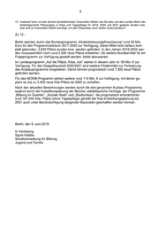9 12. Inwieweit kann mit den derzeit bereitstehenden finanziellen Mitteln des Bundes und des Landes Berlin der bedarfsgerechte Platzausbau in Kitas und Tagespflege für 2019, 2020 und 2021 gedeckt werden bzw. was wird an finanziellen Mitteln benötigt, um den Kitaausbau auch weiter voranzutreiben? Zu 12.: Berlin standen durch das Bundesprogramm „Kinderbetreuungsfinanzierung“ rund 55 Mio. Euro für den Programmzeitraum 2017-2020 zur Verfügung. Diese Mittel sind nahezu kom- plett gebunden. 3.620 Plätze wurden bzw. werden gefördert. In den Jahren 2019-2022 wer- den voraussichtlich noch rund 2.500 neue Plätze entstehen. Ob weitere Bundesmittel für ein Folgeprogramm zur Verfügung gestellt werden, bleibt abzuwarten. Im Landesprogramm „Auf die Plätze, Kitas, los!“ stehen in diesem Jahr rd. 59 Mio. € zur Verfügung. Für den Doppelhaushalt 2020/2021 sind weitere Fördermittel zur Fortsetzung des Ausbauprogramms vorgesehen. Damit können prognostisch rund 7.300 neue Plätze gefördert werden. Für das MOKIB-Programm stehen weitere rund 110 Mio. € zur Verfügung, mit denen ge- plant ist, bis zu 3.400 neue Kita-Plätze ab 2020 zu schaffen. Nach den aktuellen Berechnungen werden durch die drei genannten Ausbau-Programme, ergänzt durch die Investitionsplanung der Bezirke, städtebauliche Verträge, der Programme „Bildung im Quartier“, „Soziale Stadt“ und „Stadtumbau“, die prognostisch erforderlichen rund 187.000 Kita- Plätze (ohne Tagespflege) gemäß der Kita-Entwicklungsplanung bis 2021 auch unter Berücksichtigung steigender Baukosten geschaffen werden können. Berlin, den 8. Juni 2019 In Vertretung Sigrid Klebba Senatsverwaltung für Bildung, Jugend und Familie