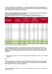 2 7 Jahren. Bezogen auf die Gruppe der 3- bis unter 6-jährigen lag die Betreuungsquote, d. h. der Anteil der betreuten Berliner Kinder an der Gesamtzahl aller Kinder dieser Altersgruppe, zum Stichtag bei 91,9 Prozent (siehe Tabelle 1). Tabelle 1: Verhältnis der betreuten Kinder nach Altersgruppen zur Gesamtzahl der Kinder in der Altersgruppe der 0- bis unter 7-Jährigen in Berlin gesamt am 31.12.2018 Quelle: ISBJ-KiTa-Fachverfahren; Stand: 31.12.2018 - Festschreibungen, ohne Brandenburger Kinder; Einwohnerregister; Stand: 31.12.2018, Amt für Statistik Berlin-Brandenburg (mit Nachmeldungen der 0- bis unter 1- Jährigen) Kita Tagespflege Einwohner lt. (finanzierte und belegte (finanzierte und Betreuungsangebote nur Berliner Kinder Plätze) belegte Plätze) gesamt Einwohnerregis- (o. Brandenburg) (nur Berliner Kinder) (nur Berliner Kinder) ter 31.12.2018 Anz. in % Anz. in % Anz. in % 0 bis unter 1 Jahr 39.521 350 0,9% 131 0,3% 481 1,2% 1 bis unter 2 Jahre 39.556 19.823 50,1% 2.173 5,5% 21.996 55,6% 2 bis unter 3 Jahre 39.670 29.190 73,6% 1.961 4,9% 31.151 78,5% 0 bis unter 3 Jahre 118.747 49.363 41,6% 4.265 3,6% 53.628 45,2% 1 bis unter 3 Jahre 79.226 49.013 61,9% 4.134 5,2% 53.147 67,1% 3 bis unter 4 Jahre 37.526 32.809 87,4% 628 1,7% 33.437 89,1% 4 bis unter 5 Jahre 36.910 33.839 91,7% 386 1,0% 34.225 92,7% 5 bis unter 6 Jahre 34.843 32.412 93,0% 333 1,0% 32.745 94,0% 6 bis unter 7 Jahre 34.568 10.792 31,2% 89 0,3% 10.881 31,5% 3 bis unter 6 Jahre 109.279 99.060 90,6% 1.347 1,2% 100.407 91,9% 0 bis unter 6 Jahre 228.026 148.423 65,1% 5.612 2,5% 154.035 67,6% 0 bis unter 7Jahre 262.594 159.215 60,6% 5.701 2,2% 164.916 62,8% ohne 163 Kinder 7 Jahre und älter (161 Kita und 2 Tagespflege) In den beigefügten Anlagen 1 und 1 2 sind die in Anspruch genommenen finanzierten und belegten Kindertagesbetreuungsangebote differenziert nach Angebotsformen (Kita, Tages- pflege), Bezirken, Altersjahrgängen und Betreuungsumfang sowie die Betreuungsquoten aufgeführt. 4. Wie erklärt und bewertet der Senat die Entwicklung der Betreuungsquote der Kinder in den jeweiligen Jahrgängen? Zu 4.: Die Betreuungsquote ist definiert als der prozentuale Anteil der betreuten Kinder des Bezir- kes (unabhängig davon, in welchem Bezirk die Betreuung stattfindet) an den gleichaltrigen Einwohnerinnen und Einwohnern des Bezirks. 1 Bitte berücksichtigen, dass in der Anlage 1 und 2 nicht die 138 Kinder einbezogen sind, die über einen reinen Sprachför- dergutschein verfügen!