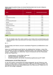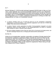 4 Tabelle 3: Belegte Kita- Plätze absolut und in Relation nach Anbietergruppen (Eigenbetrieb; Freie Träger) für Berlin am 31.12.2018 (ohne Brandenburger Kinder, nach Wohnortprinzip) Quelle: ISBJ-KiTa-Fachverfahren; Stand: 31.12.2018 - Festschreibungen finanzierte und darunter in Kitas der Eigenbe- darunter in Kitas der freien nur Berliner Kinder belegte Plätze in triebe des Landes Berlin Jugendhilfe (o. Brandenburg) Kitas Wohnortprinzip Anz. in % Anz. in % 0 bis unter 1 Jahr 350 91 26,0% 259 74,0% 1 bis unter 2 Jahre 19.823 4.126 20,8% 15.697 79,2% 2 bis unter 3 Jahre 29.190 5.830 20,0% 23.360 80,0% 0 bis unter 3 Jahre 49.363 10.047 20,4% 39.316 79,6% 1 bis unter 3 Jahre 49.013 9.956 20,3% 39.057 79,7% 3 bis unter 4 Jahre 32.809 6.861 20,9% 25.948 79,1% 4 bis unter 5 Jahre 33.839 7.143 21,1% 26.696 78,9% 5 bis unter 6 Jahre 32.412 6.887 21,2% 25.525 78,8% 6 bis unter 7 Jahre 10.792 2.461 22,8% 8.331 77,2% 3 bis unter 6 Jahre 99.060 20.891 21,1% 78.169 78,9% 0 bis unter 6 Jahre 148.423 30.938 20,8% 117.485 79,2% 0 bis unter 7 Jahre 159.215 33.399 21,0% 125.816 79,0% ohne 161 Kinder 7 Jahre und älter davon 40 Kinder in den Eigenbetrieben und 121 Kinder bei den freien Trägern der Jugendhilfe In der beigefügten Anlage 3 ist die Differenzierung der Belegung nach Bezirken sowie die Betreuungsquoten nach Alter dargestellt. 6. Wie viele Kinder profitierten zum Zeitpunkt 31.12.2018 von wie viel zusätzlichen Personalstellen für die Sprachförderung gemäß § 17 VOKitaFöG, wie viele Kinder mit Sprachförderbedarf wurden nicht zusätzlich gefördert, weil die Kita, die sie besuchten, keinen Anteil von 40 % Kindern nichtdeutscher Herkunftssprache hatte? Zu 6.: Am 31.12.2018 wurden berlinweit insgesamt 50.046 Kinder nicht deutscher Herkunft (ndH) im Alter von 0 bis unter 7 Jahren in öffentlichen und öffentlich geförderten Kindertagesein- richtungen betreut in deren Familien nach eigenen Angaben überwiegend nicht deutsch gesprochen wird. Davon wurde in 32.709 Fällen ein ndH-Zuschlag registriert. Gemäß den Personalzuschlägen nach §17 Kindertagesförderungsverordnung (VOKitaFöG) wurde, be- zogen auf die Vertragszahlen zum 31.12.2018, zusätzliches Fachpersonal im Umfang von rund 556 Vollzeitäquivalenten für Kinder mit ndH-Zuschlag finanziert. 7. Wie viele Kinder profitierten zum Zeitpunkt 31.12.2018 von wie viel zusätzlichem Personal gemäß § 18 VOKitaFöG für die Förderung von Kindern, die in Wohngebieten mit sozial benachteiligenden Bedingungen leben?
