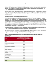 8 Weitere 35 Projekte, die im Förderjahr 2019 beantragt wurden, konnten positiv beschieden werden. Bis Ende 2019 können mit Hilfe dieser Projekte bei positivem Bauverlauf bis zu 1.074 weitere Plätze fertiggestellt werden. Derzeit (Stand 27.05.19) werden weitere 70 Projektanträge geprüft. Eine bezirklich differen- zierte Übersicht der Projektanträge im Landesprogramm im Förderjahr 2019 ist in der Anla- ge 5 dargestellt. Bundesprogramm „Kinderbetreuungsfinanzierung“ Durch das Bundesprogramm „Kinderbetreuungsfinanzierung“ werden insgesamt voraus- sichtlich 2.521 neue Kita- und Tagespflegeplätze im Zeitraum 2019 bis 2022 durch Neubau- , Erweiterungs- und Umbaumaßnahmen sowie Ausstattungen in der Kindertagespflege ge- schaffen. Hinzu kommen weitere 158 gesicherte Kita- und Kindertagespflegeplätze. Im Jahr 2019 werden voraussichtlich 1.055 neue Kita- und Kindertagespflegeplätze mit Hilfe des Bundesprogramms geschaffen. Die bezirksgenaue und nach Maßnahmenart differenzierte Aufstellung ist der Anlage 6 zu entnehmen. Insgesamt werden im Jahr 2019 durch die beiden Förderprogramme voraussichtlich bis zu 5.793 zusätzliche Kita-Plätze zur Verfügung gestellt werden können. Die bezirksbezogene Bereitstellung der Kita-Plätze für 2019 aus dem Bundes- und Landes- programm ist in der nachfolgenden TabelleTabelle 6 dargestellt. Tabelle 6: bezirksbezogene Bereitstellung der Kita-Plätze prognostisch für 2019 aus dem Bundes- und Landesprogramm Quelle: SenBJF Fertigstellung von Kita-Plätzen aus dem Bundes- und Landesprogramm Bezirk im Jahr 2019 Mitte 642 Friedrichshain-Kreuzberg 220 Pankow 643 Charlottenburg-Wilmersdorf 118 Spandau 611 Steglitz-Zehlendorf 389 Tempelhof-Schöneberg 581 Neukölln 177 Treptow-Köpenick 618 Marzahn-Hellersdorf 743 Lichtenberg 561 Reinickendorf 490 Berlin 5.793