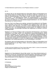 -9- 13. Welche Maßnahmen ergreift der Senat, um den Pflegeberuf attraktiver zu machen? Zu 13.: Im Rahmen des von der Senatsverwaltung für Gesundheit, Pflege und Gleichstellung initi- ierten Berliner Pakts für die Pflege sollen sich die Akteure selbst dazu verpflichten, für at- traktivere Arbeitsbedingungen in der Pflege zu sorgen. Es sollen insgesamt drei Ziele er- reicht werden: 1. der bedarfsgerechte Ausbau von Ausbildungszahlen, 2. eine bessere Vergütung zunächst in der Ausbildung und 3. die Schaffung attraktiver Arbeitsbedingun- gen durch die Einführung von Gesundheitsmanagementstrukturen und einer besseren Vereinbarkeit von Familie und Beruf. Durch den Pakt für die Pflege soll es gelingen, genügend Auszubildende für die Pflegebe- rufe zu generieren und sie nach ihrer Ausbildung auch möglichst lange in dem Beruf zu halten. Ebenso sollen Menschen, die bereits in einem Pflegeberuf tätig sind, durch die verbesserten Lohn- und Arbeitsbedingungen motiviert werden, ihre Tätigkeit so lange wie möglich auszuüben, und ehemalige Fachkräfte nach Möglichkeit zur Rückkehr in den Be- ruf bewegt werden. Begleitend zum Pakt für die Pflege wurden im November 2018 Workshops zu den Themen „Ausbildung in der Pflege stärken“ und „Betriebliches Gesundheitsmanagement (BGM) ausweiten“ durchgeführt, um den Akteuren Ideen für attraktivere Arbeitsbedingungen an die Hand zu geben. Außerdem werden gemeinsam mit der Senatsverwaltung für Integrati- on, Arbeit und Soziales Sozialpartnergespräche mit den Arbeitgeberverbänden und den Gewerkschaften durchgeführt, um über eine Angleichung der Ausbildungsvergütung in der Altenpflege an die Ausbildungsvergütung in der Krankenpflege zu verhandeln. Des Weiteren plant die Senatsverwaltung für Gesundheit, Pflege und Gleichstellung eine Ausbildungsoffensive für die Pflege in Berlin, mit der die Ausbildung unterstützt und ver- bessert werden soll. 14. Wann ist mit einer Publikation zum Thema „Gesund älter werden in Berlin“ zu rechnen, die insbesondere die gesundheitlichen Aspekte der Älteren in den Fokus nimmt? Zu 14.: Begleitend zum Gesundheitsziel „Gesund älter werden“ ist ein Gesundheitsmonitoring mit Indikatoren aus den drei Themenbereichen Soziodemographie, Gesundheit und Partizipa- tion im Aufbau. Schwerpunktmäßig wird in 2019 an entsprechenden Datenblättern zum Gesundheitszustand und der pflegerischen Versorgung gearbeitet. Berlin, den 24. April 2019 In Vertretung Martin Matz Senatsverwaltung für Gesundheit, Pflege und Gleichstellung