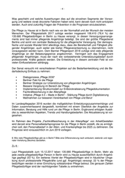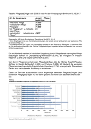 -5- Tabelle: Pflegebedürftige nach SGB XI nach Art der Versorgung in Berlin am 15.12.2017 Art der Versorgung Anzahl Pflege- bedürftige Ambulante Pflege 34.550 Vollstationäre Pflege 29.246 Pflegegeld * 71.860 Mit Pflegegrad 1 u. teilstatio- 24 närer Pflege nachrichtlich: teilstationäre 2.977 Pflege** Datenquelle: AfS Berlin-Brandenburg / Darstellung: SenGPG - II A 5 * Ohne Empfänger/innen von Kombinationsleistungen, die bereits bei der ambulanten oder stationären Pfle- ge berücksichtigt sind. ** Empfänger/innen von Tages- bzw. Nachtpflege erhalten in der Regel auch Pflegegeld o. ambulante Pfle- ge. Sie sind dadurch bereits in der Zahl der Pflegebedürftigen insgesamt erfasst und werden hier nur nach- richtlich ausgewiesen. Die mit Abstand meisten in häuslicher Umgebung durch Pflegedienste versorgten Pflege- bedürftigen wohnen in Charlottenburg-Wilmersdorf (5.376), die wenigsten in Treptow- Köpenick (2.216) und Steglitz-Zehlendorf (2.221). Von den in Pflegeheimen betreuten Pflegebedürftigen lebt die höchste Anzahl Pflegebe- dürftiger in Steglitz-Zehlendorf (4.439) und Pankow (3.429). Mit Abstand die wenigsten Pflegeheimbewohner sind in Friedrichshain-Kreuzberg (1.790) untergebracht. Die weiteren Zahlen sind nachfolgender Abbildung zu entnehmen. Daten zur Zahl der ausschließlich durch Angehörige betreuten Pflegebedürftigen (aus- schließlich Pflegegeld) liegen nur für Berlin gesamt und nicht nach Bezirken differenziert vor: Abbildung: Pflegebedürftige nach SGB XI in Pflegeheimen und Pflegediensten in Berlin am 15.12.2017 nach Bezirken Reinickendorf 2.659 2.285 Lichtenberg 2.405 2.902 Marzahn-Hellersdorf 2.723 2.119 Treptow-Köpenick 2.216 2.786 Neukölln 2.331 2.163 Tempelhof-Schöneberg 3.352 2.372 Steglitz-Zehlendorf 2.221 4.439 Spandau 2.436 2.673 Charlottenburg-Wilmersdorf 5.376 2.791 Pankow 3.398 3.429 Friedrichshain-Kreuzberg 2.267 1.790 Mitte 3.166 2.522 0 1.000 2.000 3.000 4.000 5.000 6.000 7.000 8.000 9.000 Pflegebedürftige Pflegebedürftige in Pflegediensten Pflegebedürftige in Pflegeheimen (Datenquelle: AfS Berlin-Brandenburg / Darstellung: SenGPG - II A 5 -)