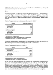 -6- 9. Welche Kapazitäten stehen im ambulanten und stationären Bereich zur Bedarfsdeckung zur Verfügung? Ist das Angebot bedarfsgerecht oder gibt es Lücken? Zu 9.: Die amtliche Statistik zur Pflege im Rahmen der Pflegeversicherung – „Pflegestatistik“ – wird regelmäßig im Zwei-Jahres-Abstand zum 15.12. des Erhebungsjahres erhoben. Die Anzahl der Pflegeeinrichtungen und Pflegedienste nach Angebot laut Pflegestatistik 2017 (bzw. der Sen GPG zu Pflege-Wohngemeinschaften) ist nachfolgender Tabelle zu ent- nehmen: Tabelle: Pflegeeinrichtungen und -dienste in Berlin am 15.12.2017 Angebot Anzahl der Angebote Ambulante Angebote Pflegedienste 613 Pflege-WGen 1 645 Pflegeheime insgesamt,, 391 darunter nach Angebot* Tagespflege 91 Kurzzeitpflege 18 Dauerpflege 305 * Mehrfachzählung ausgeschlossen Datenquelle: Amt für Statistik Berlin-Brandenburg - Pflegestatistik 1 Datenquelle: Sen GPG - II D, LaGeSo – Heimaufsicht Die Anzahl der Pflegeplätze nach Angebot laut Pflegestatistik 2017 (bzw. der Sen GPG zu Pflege-Wohngemeinschaften) ist nachfolgender Tabelle zu entnehmen: Tabelle: Pflegeplätze in Berlin am 15.12.2017 Angebot Plätze Ambulante Angebote Pflege-WGen1 4.884 (teil-) stationäre Angebote, davon 35.103 Tagespflege 1.828 Kurzzeitpflege 357 Dauerpflege 32.918 Datenquelle: Amt für Statistik Berlin-Brandenburg 1 Datenquelle: Sen GPG - II D, LaGeSo - Heimaufsicht Im Mai 2018 gab es in ganz Berlin 33.192 Plätze in 289 vollstationären Pflegeeinrichtun- gen, die im Durchschnitt zu 89 % ausgelastet waren. Das bedeutet, dass ca. 29.540 Pfle- geplätze im Land Berlin belegt und ca. 3.652 Pflegeplätze frei verfügbar waren. Nach der- zeitigem Stand steht in Berlin aktuell insgesamt ein ausreichendes Angebot an Pflegeplät- zen mit einer durchschnittlichen Auslastungsquote von rund 89 % zur Verfügung. Insofern bestehen noch ausreichende Aufnahmekapazitäten, um die Versorgung von Pflegebedürf- tigen sicherzustellen. Der Senat beobachtet die weitere Entwicklung aber sehr genau.