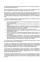 -7- Die nächste Bundespflegestatistik wird für den Stichtag 15.12.2019 erwartet. Aktuelle Zah- len liegen deshalb derzeit nicht vor. Der Landespflegeplan prognostiziert für Berlin für das Jahr 2030 den Platzbedarf für Be- wohner und Bewohnerinnen stationärer Pflegeeinrichtungen auf ca. 42.500. Die Beschaffung von ambulanten pflegerischen Versorgungsleistungen geschieht in der Regel durch die Privatperson selbst bzw. pflegende Angehörige nahestehende oder ver- tretungsberechtigte Personen. Die 36 Berliner Pflegestützpunkte unterstützen bei der Su- che eines geeigneten Pflegedienstes, bei Bedarf koordinieren sie auch die notwendigen Hilfen. Von Bezirken, Pflegestützpunkten, pflegebedürftigen Menschen bzw. pflegenden Angehö- rigen gehen zunehmend Hinweise ein, dass das Finden eines Pflegedienstes, der die ambulante pflegerische Versorgung über- nimmt, schwieriger wird Pflegedienste mit Hinweis auf Personalmangel die Übernahme von Aufträgen ab- lehnen pflegebedürftige Menschen bzw. pflegende Angehörige und um Unterstützung ge- betene Pflegestützpunkte immer mehr Anstrengungen unternehmen müssen, um benötigte Leistungen zu erhalten bzw. zu vermitteln eine Auswahl zwischen mehreren Pflegediensten immer seltener möglich ist pflegebedürftige Menschen bzw. pflegende Angehörige zeitlich immer weniger Wahlmöglichkeiten haben Zeiten, in denen privat zur Überbrückung Lösungen gefunden werden müssen, ob- wohl eine Unterstützung durch einen Pflegedienst gewünscht oder benötigt wird, sich verlängern, insbesondere Menschen mit Pflegegrad 1 und Anspruch auf Entlastungsleistungen öfter keine Pflegedienste finden, die für diese kleinen Aufträge (haushaltsnahe Dienstleistungen) zur Verfügung stehen. Hier versucht die Senatsverwaltung durch Stärkung der Angebote zur Unterstützung im Alltag Abhilfe zu schaffen. Es sind derzeit aber im Sachleistungsbereich des SGB XI keine Fälle bekannt, in denen bisher Menschen dauerhaft unversorgt blieben. Von Seiten der Pflegedienste gehen ebenfalls zunehmend Hinweise ein, dass Anfragen zur Erbringung von Leistungen der Häuslichen Pflegehilfe leider nicht/nur beschränkt/mit zeitlicher Verzögerung bedient werden können, weil den Pflegediensten das für die Ver- sorgung notwendige Pflegepersonal und damit die notwendigen Kapazitäten fehlen. Aus Hinweisen der Leistungsanbieter deutet sich gleichzeitig an, dass der Pflegekräfte- mangel derzeit primär Pflegefachkräfte betrifft. Diese werden vor allem im Bereich der häuslichen Krankenpflege im SGB V eingesetzt. Belastbare Daten zu Art und Umfang lie- gen der Senatsverwaltung jedoch nicht vor. Aufgrund des Pflege(fach)kräftemangels muss auch im Sachleistungsbereich des SGB XI mit Engpässen gerechnet werden. Der Senat unternimmt deshalb vielfältige Aktivitäten, um dem Personalmangel und den damit verbundenen Versorgungsproblemen entgegen zu wirken.
